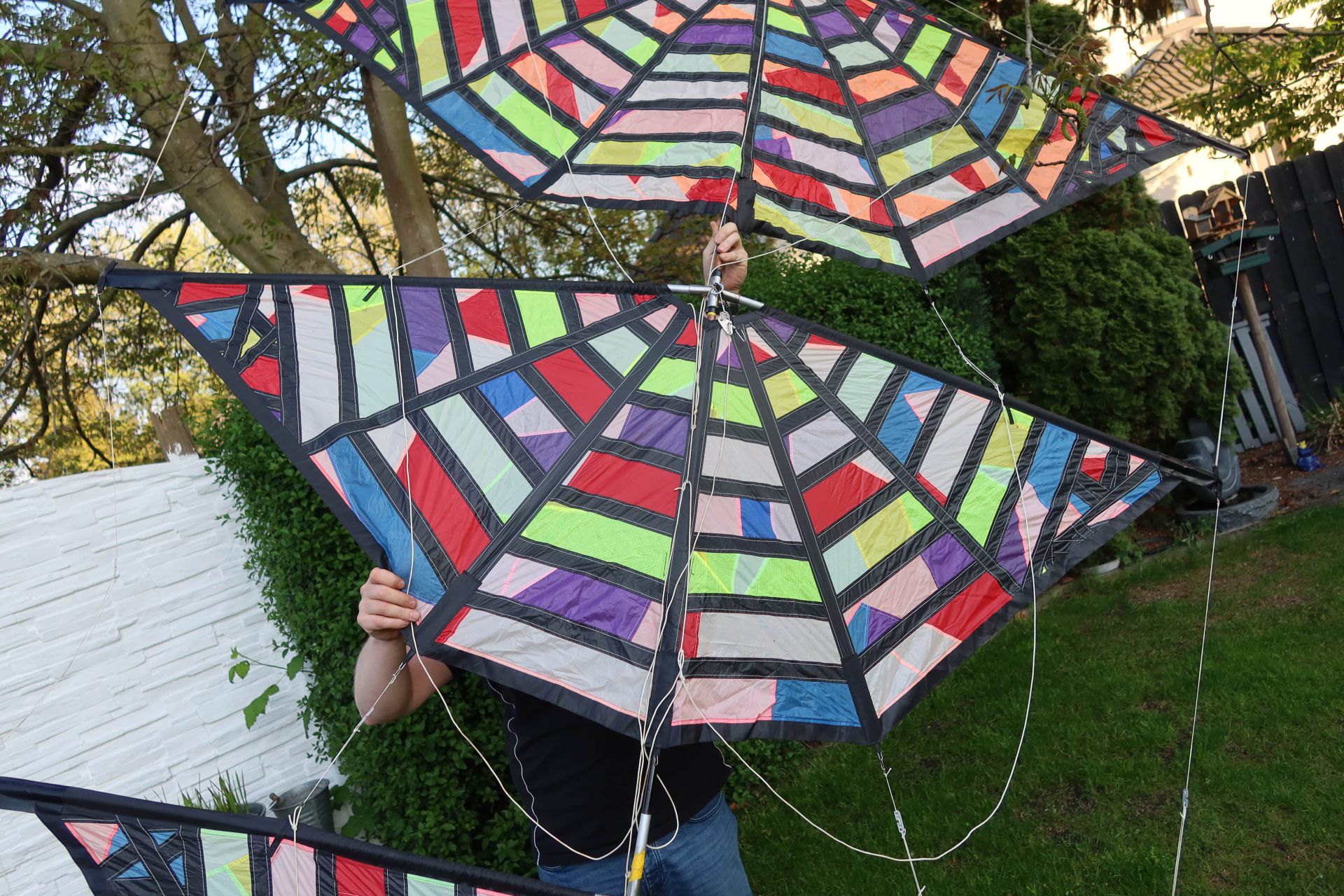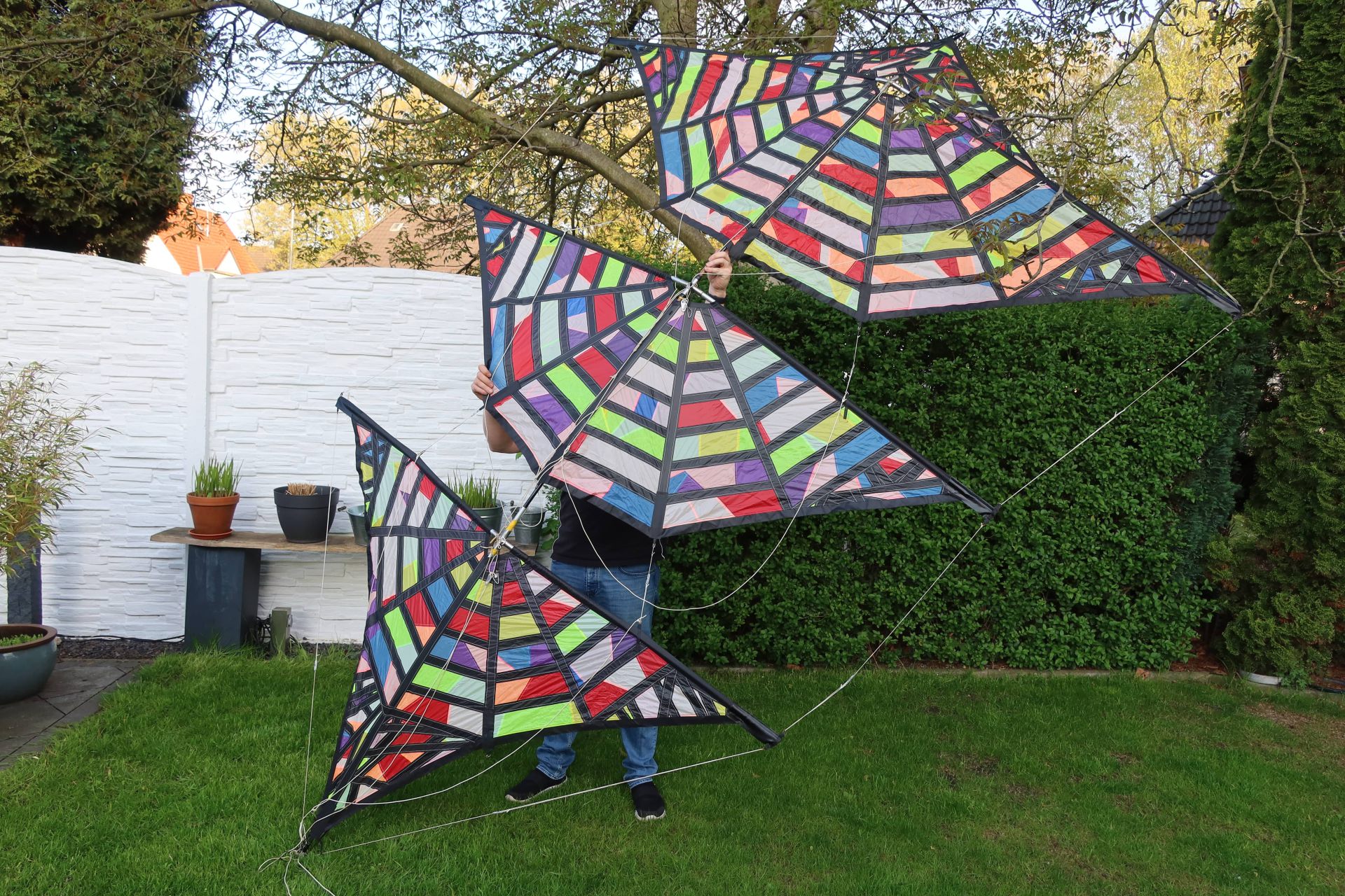 Yvonne de Mille ist eine international bekannte Drachenkünstlerin aus Ōtaki, Neuseeland. Ihre Spezialität: großformatige, farbenprächtige Windskulpturen, die Kunst und traditionelles Drachenhandwerk verbinden. Charlotte’s Web ist eines ihrer eindrucksvollsten Werke – ein farbenfroher Großdrachen mit einer symbolhaften Netzstruktur, inspiriert vom gleichnamigen Kinderbuchklassiker. Der Drachen misst 3,9 m Höhe und 2,8 m Breite. Die Bespannung besteht aus Spinnacker-Ripstop-Nylon, das zu einem mosaikartigen, radialsymmetrischen Muster vernäht wurde. Die vielfarbigen Paneele sind von schwarzen Streifen eingefasst, wodurch ein leuchtender Fensterrosen-Effekt entsteht – ein Markenzeichen vieler Werke von de Mille. Das Gestänge besteht aus 13 mm Glasfaserstäben, verbunden durch robuste Metallstücke, wie sie bei großen Showdrachen üblich sind. Charlotte’s Web ist ein mehrflächiger Einleinerdrachen, aufgebaut in einer sternförmig gegliederten Struktur mit mehreren horizontalen und diagonalen Segelarmen. Die ausgeklügelte Mehrpunkt-Waage ermöglicht eine stabile, steile Fluglage. Trotz seiner Größe bleibt der Drachen überraschend leicht und gut beherrschbar – auch bei mittleren Winden (ab ca. 2 Bft). Das Design verteilt Winddruck effizient, wodurch der Drachen auch bei böigem Wetter ruhig fliegt. De Mille versteht ihre Drachen als „fliegende Bilder“: Charlotte’s Web ist nicht nur ein Flugobjekt, sondern eine bewegte Lichtskulptur, die sich im Sonnenlicht verwandelt. Sie ist ein herausragendes Beispiel für Windkunst – ästhetisch, technisch anspruchsvoll und emotional wirkungsvoll. Charlotte’s Web ist ein Einzelstück. Der Drachen steht exemplarisch für eine neue Generation künstlerischer Drachen, die nicht nur fliegen, sondern erzählen und staunen lassen.