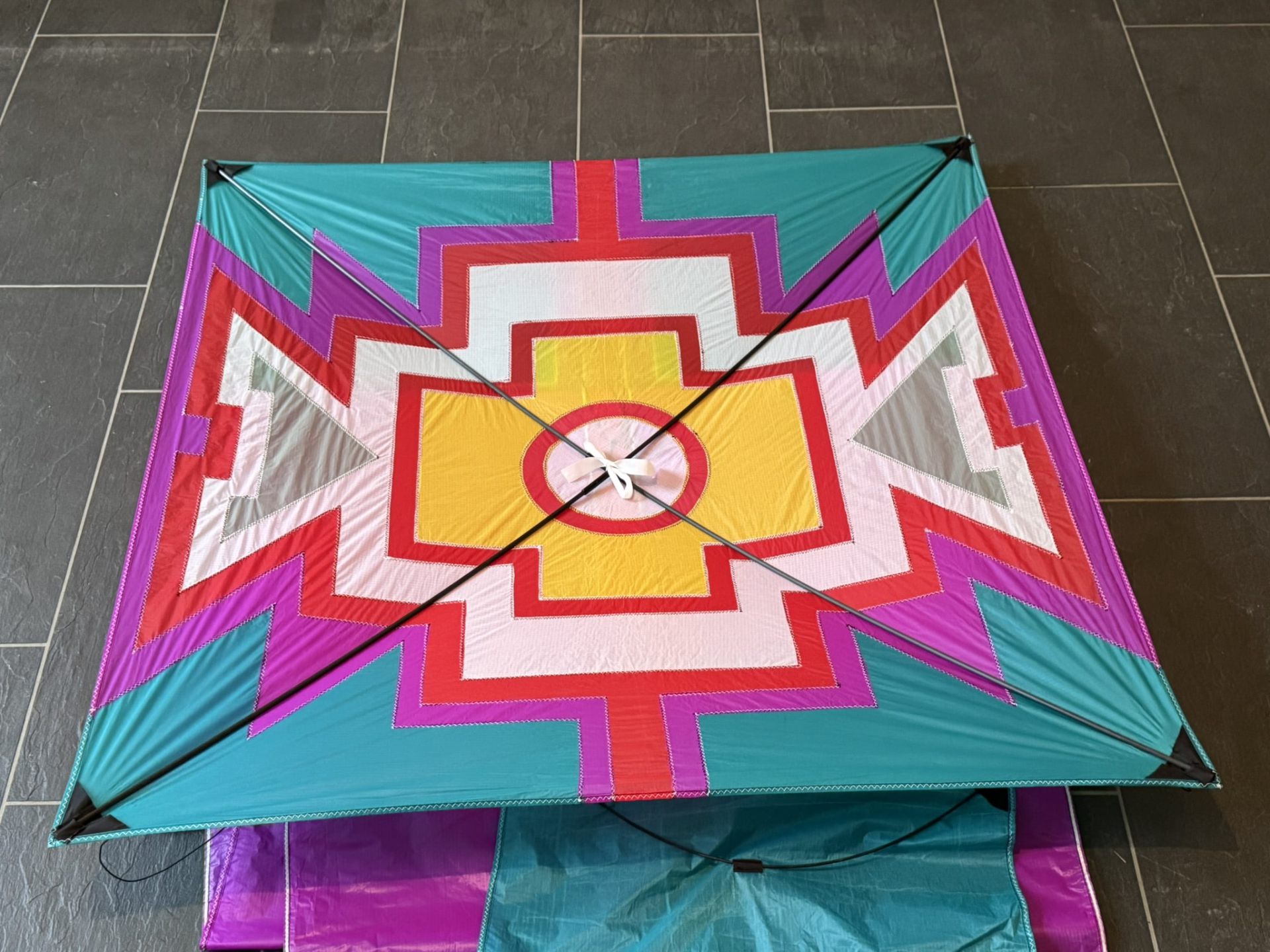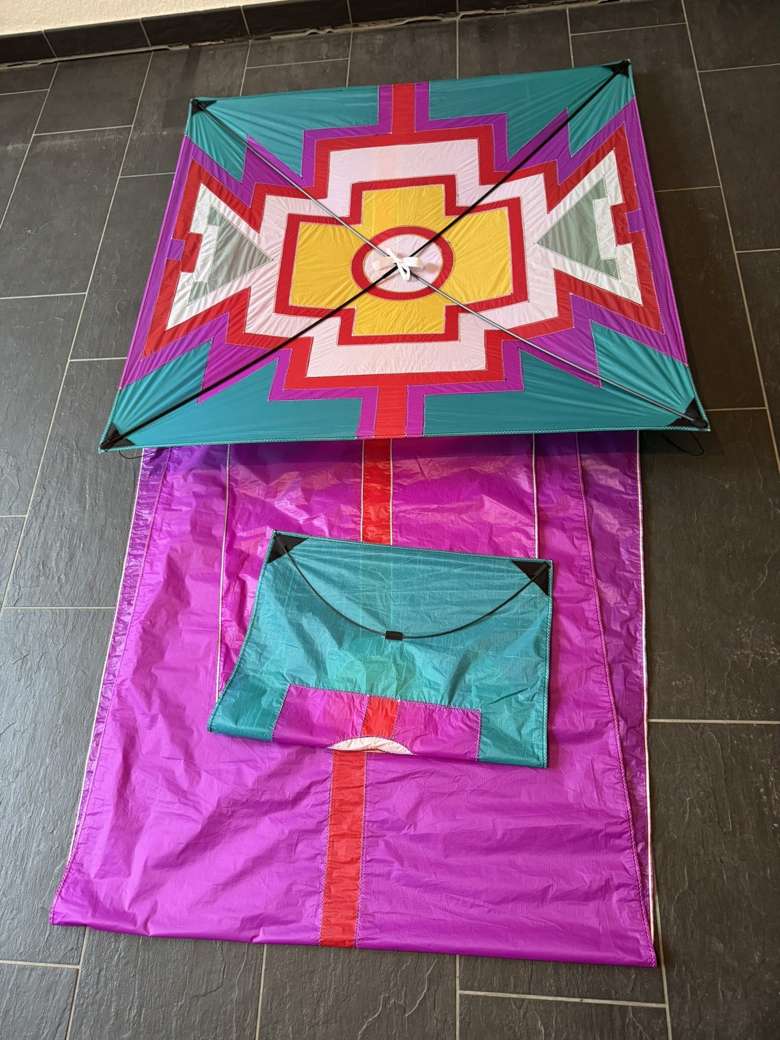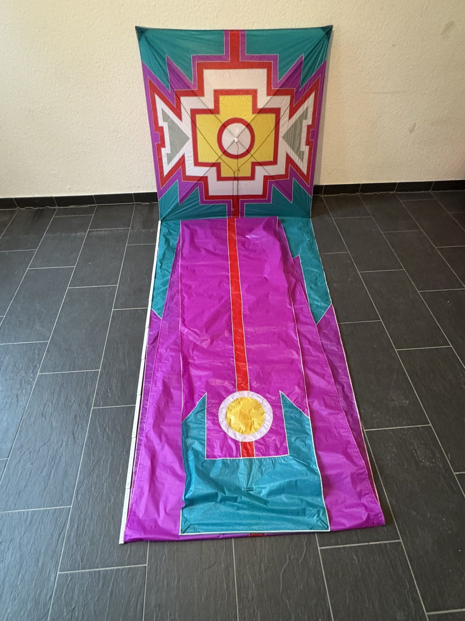 Der „Della Porta“ ist ein eindrucksvoller Einleiner-Drachen in klassischer Rechteckform, inspiriert vom historischen Drachenmodell des Renaissancegelehrten Giambattista della Porta. Mit seiner markanten, geometrischen Gestaltung und der kraftvollen Farbgebung in Violett, Türkis, Gelb und Rot vereint dieser Drachen ästhetische Raffinesse mit funktionaler Stabilität. Die Segelfläche besteht aus hochwertigem, leichtem Spinnaker-Nylon und ist mit einem stabilen Kreuzgestänge aus Kohlefaser ausgestattet, das für einen zuverlässigen und ruhigen Flug sorgt. Ein besonderes Merkmal des „Della Porta“ ist sein appliziertes Reflexband, das ihn auch bei Nachtflügen sichtbar macht. Dieses reflektierende Element verleiht dem Drachen bei Dunkelheit eine faszinierende, leuchtende Präsenz am Himmel. Der lange, farblich abgestimmte Schweif unterstützt die Flugstabilität und unterstreicht die eindrucksvolle Erscheinung des Drachen in Bewegung. Dank seiner robusten Bauweise, dem präzisen Zugsystem und der durchdachten Ausstattung ist der „Della Porta“ sowohl für kulturelle Veranstaltungen und Drachenfeste als auch für den ambitionierten Freizeitflug ideal geeignet. Er verbindet historische Wurzeln mit moderner Funktionalität und ist ein echter Blickfang – bei Tag und bei Nacht.