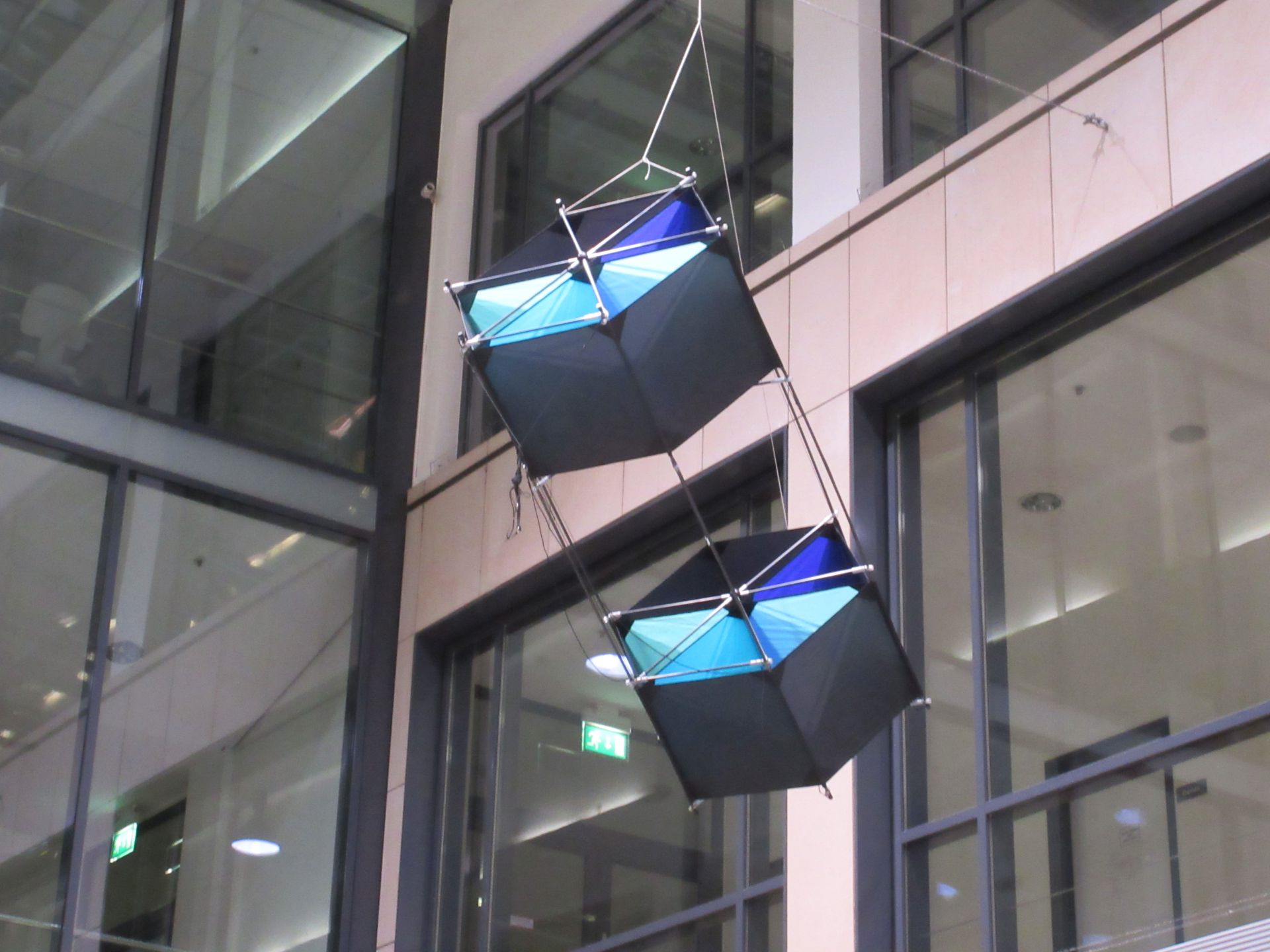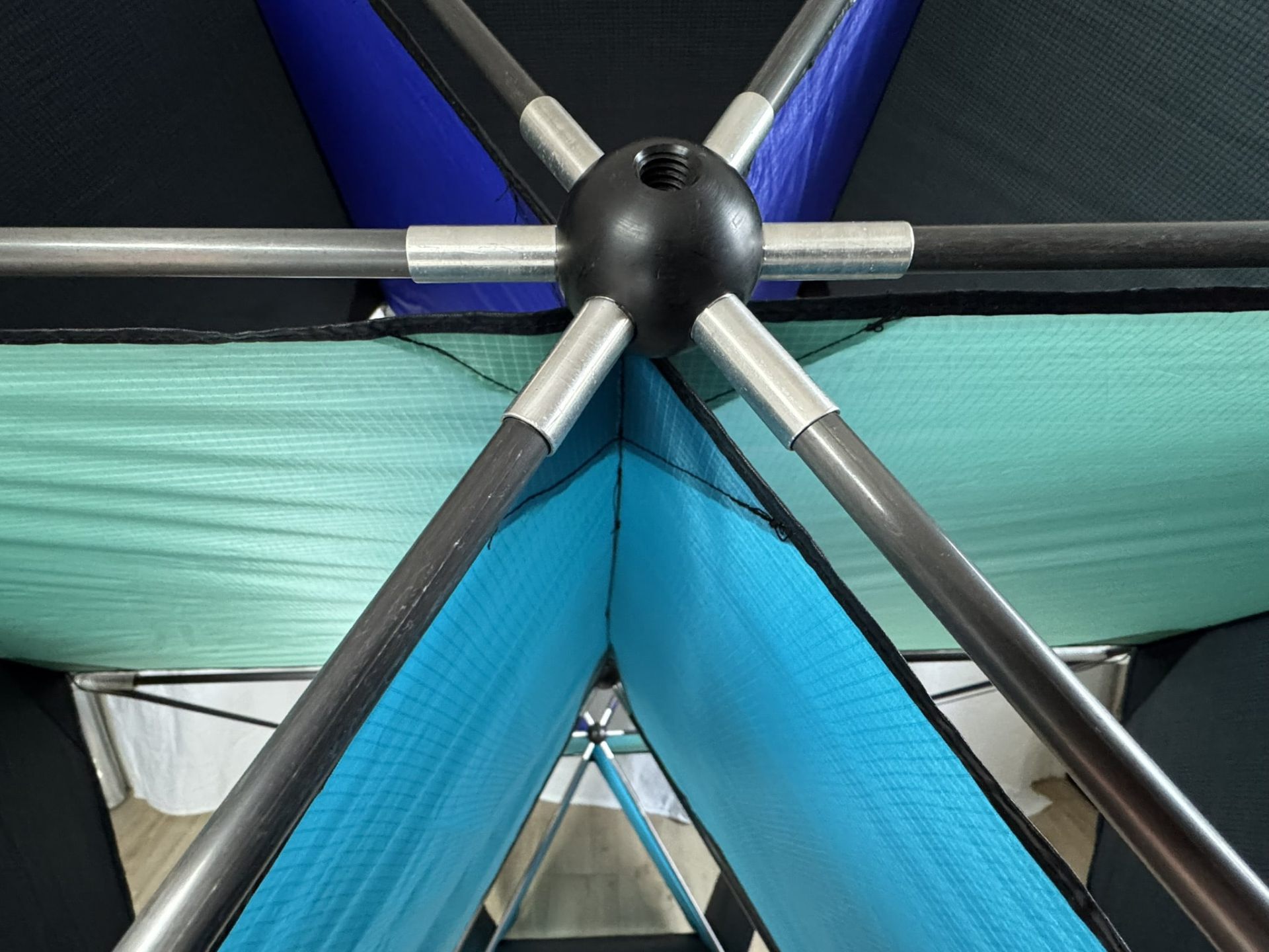 Der angebotene Kastendrachen ist eine außergewöhnliche Einzelanfertigung vermutlich aus der Werkstatt CUT Kite in Göttingen und stellt ein technisches High-End-Produkt der 1990er Jahre dar. Die Konstruktion misst ca. 205 cm x 110 cm x 90 cm und besteht aus hochwertigem Spinnackernylon in der Farbkombination Schwarz, Blau, Mint und Türkis. Die tragende Struktur ist mit 10 mm CFK-Rohren (25 lfdm.) ausgestattet, die über speziell gefertigte Kreuzverbinder aus Kunststoff und Aluminium form- und belastungssicher verbunden sind. Das Modell befindet sich in einem neuwertigen Zustand, wurde nie geflogen und ausschließlich in Ausstellungen präsentiert. Damit eignet sich dieses Stück sowohl für Sammler als auch für technisch interessierte Drachenbauer, die eine seltene Kastendrachen-Variante mit präziser Verarbeitung, Material-Know-how und hohem gestalterischen Anspruch suchen.