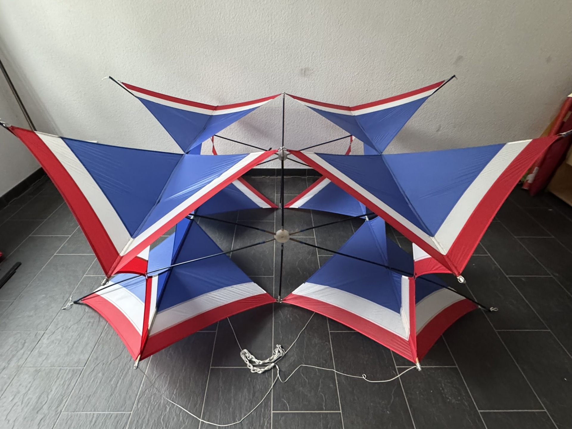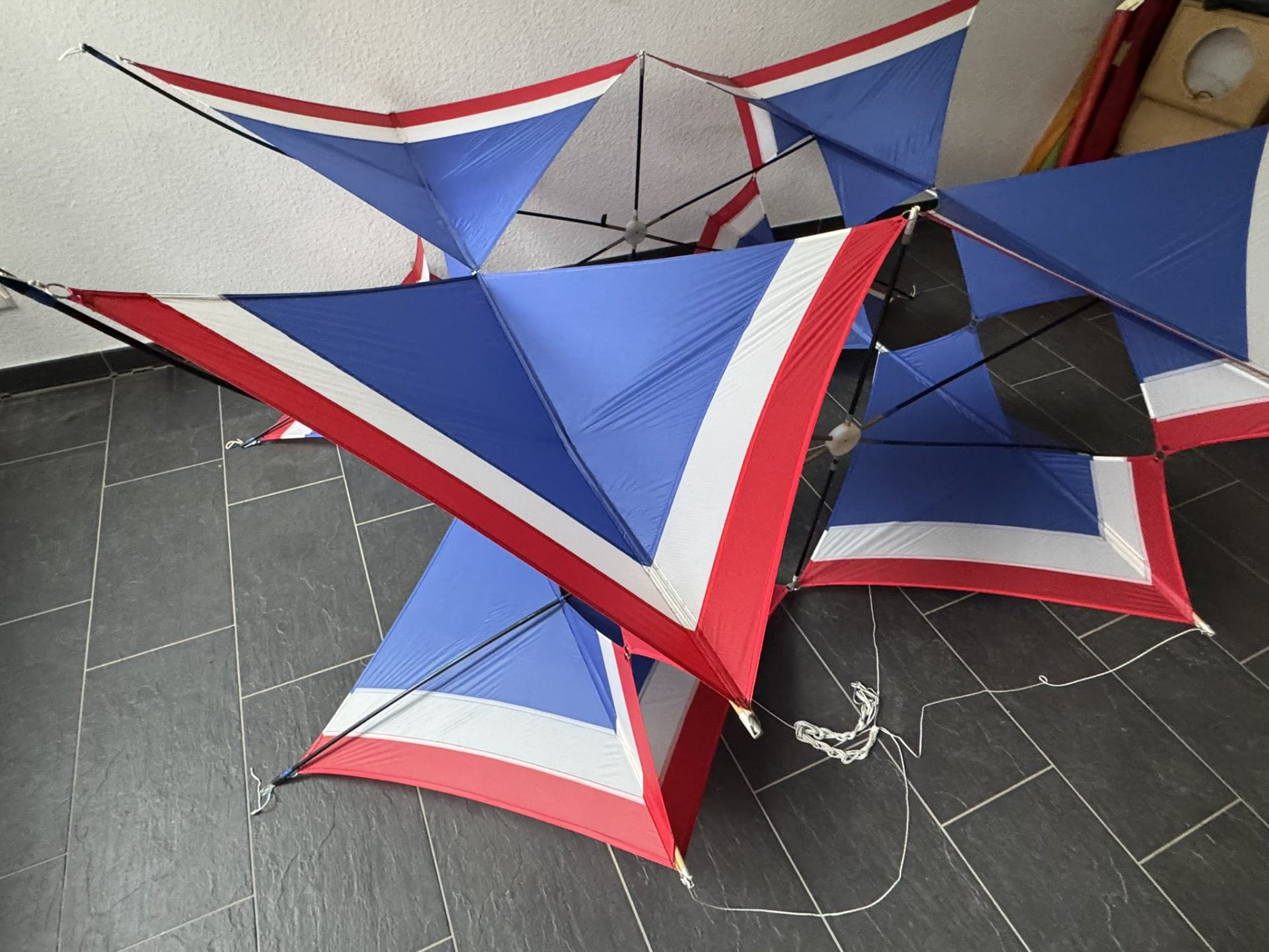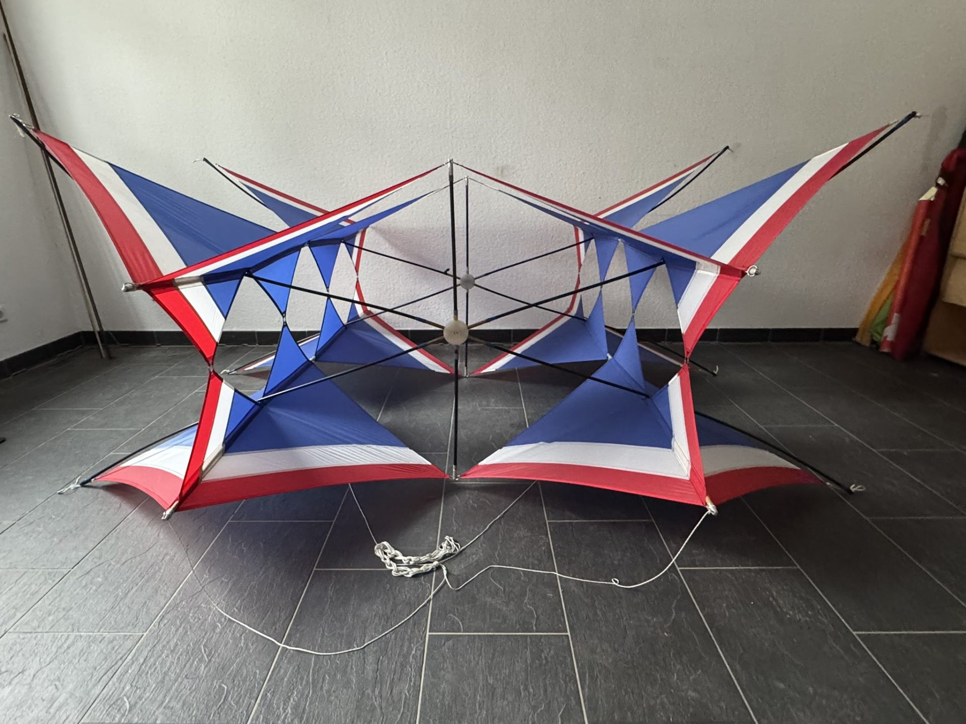Dieser außergewöhnliche Kastendrachen wurde am 15. September 1991 von Werner Ahlgrim (*21.05.1922 †01.03.2016) gefertigt – einer prägenden Persönlichkeit der deutschen Drachenfliegerszene. In sorgfältiger Handarbeit entstand ein geometrisch klar strukturierter Zellenverbund, bestehend aus vier raumgreifend angeordneten Modulen, die in ihrer Konstruktion sowohl Stabilität als auch ästhetische Raffinesse vereinen. Die markante Farbgebung in Blau, Weiß und Rot orientiert sich an den Landesfarben von Schleswig-Holstein und verleiht dem Drachen eine klare visuelle Identität. Das Modell ist als Einzelstück mit einer persönlichen Widmung versehen: „Für meine Kieler Drachenfreunde – 15.09.1991“. Diese Geste unterstreicht den engen, freundschaftlichen Charakter der Drachenbau- und Fliegerszene jener Zeit, in der Drachen nicht nur als Flugobjekte, sondern als Zeichen kreativer Gemeinschaft verstanden wurden. Ahlgrims Arbeit ist geprägt von technischem Verständnis, künstlerischem Anspruch und einem tiefen Gespür für aerodynamisches Verhalten. Dieses Exemplar steht exemplarisch für seinen Stil und seine Philosophie – ein flugfähiges Kunstwerk und zugleich ein historisches Zeugnis lebendiger Drachentradition.