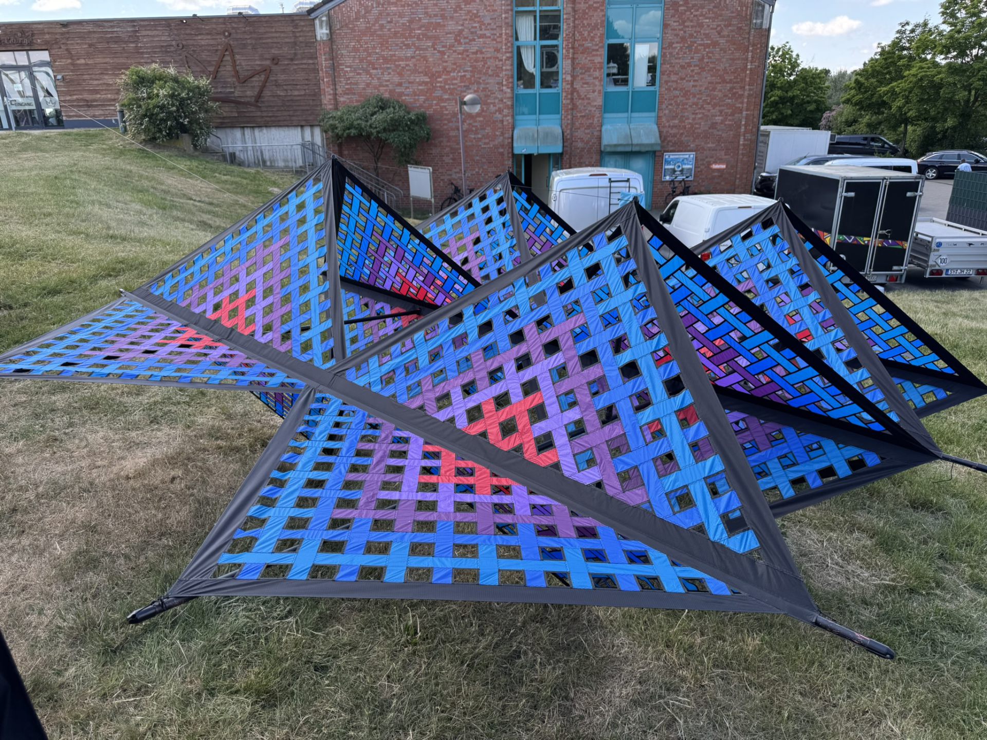 Einer von Zwei Kastendrachen von Willi Koch (1932–2015) Diese beiden einzigartigen Kastendrachen stammen aus der Werkstatt des deutschen Drachenbauers und Grafikers Willi Koch, einem der prägenden Pioniere der europäischen Drachenkunst. Seine Werke verbinden präzises technisches Handwerk mit tiefgründiger Symbolik und künstlerischer Klarheit. Die Drachen, entstanden 1998, tragen Kochs unverkennbares Streifendesign, das Bewegung, Struktur und Rhythmus vereint. Trotz ihrer imposanten Größe zeigen sie sich leicht, transparent und geometrisch harmonisch. Sie besitzen nur sehr wenige Flugstunden – das Tuch knistert noch frisch, und die Farben leuchten intensiv wie am ersten Tag. Die Farbgebung beider Objekte lädt zu vielfältigen Deutungen ein: Rot-Gelb-Schwarz steht für Feuer, Energie, Leidenschaft und Schöpfungskraft – ein Sinnbild für das aktive, schöpferische Prinzip. Blau-Violett-Rosa spiegelt Wasser, Tiefe, Ruhe und Reflexion wider – ein Symbol für das empfangende, intuitive Prinzip. Gemeinsam verkörpern sie eine Dualität, die sich in vielen von Kochs Arbeiten findet: Feuer und Wasser, Mann und Frau, Tatkraft und Besinnung, Tag und Nacht, Erde und Himmel. In ihrer Gegenüberstellung entsteht ein spannungsvolles Gleichgewicht – ein Dialog der Gegensätze, der zugleich auf die Einheit aller Dinge verweist. So sind diese Drachen mehr als flugfähige Objekte: Sie sind fliegende Skulpturen, Ausdruck von Harmonie und Balance, zugleich Zeugnis eines Künstlers, der die Grenze zwischen Technik und Poesie, Funktion und Ästhetik immer wieder neu definierte.