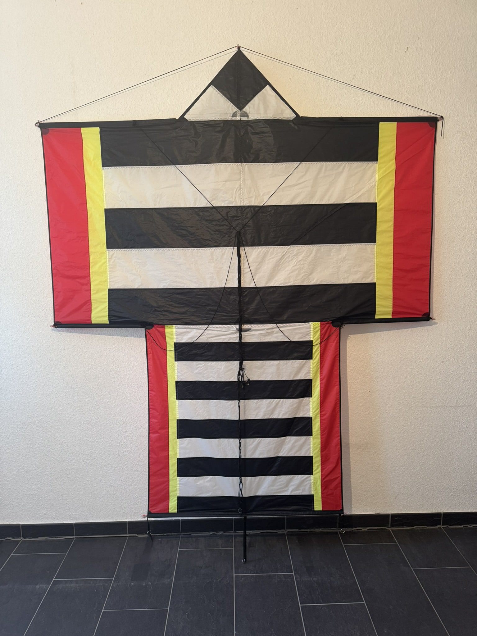 Dieses außergewöhnliche Leichtbau-Unikat vereint die traditionelle Formensprache des japanischen Sode Dako mit innovativen Materialien der modernen Konstruktionskunst. Gefertigt aus hochwertigem Spinnaker-Nylon, besticht der Kite durch seine beeindruckende Leichtigkeit und Widerstandsfähigkeit. Die markante rechteckige Struktur wird durch ein präzise verarbeitetes CFK-Gestänge gestützt, das nicht nur für Stabilität sorgt, sondern auch ein dynamisches Flugverhalten ermöglicht. Die kontrastreiche Gestaltung in Schwarz, Weiß, Rot und Gelb verleiht dem Kite eine kraftvolle optische Präsenz, die sich sowohl am Boden als auch in der Luft eindrucksvoll entfaltet. Die klare Linienführung der horizontalen Streifen wird durch die vertikalen Akzente in Rot und Gelb harmonisch ergänzt, wodurch der Kite eine unverwechselbare, fast grafische Ästhetik erhält. Ob als Blickfang am Himmel oder als dekoratives Kunstobjekt – dieses handgefertigte Einzelstück vereint traditionelle Handwerkskunst mit modernem Design. Es ist nicht nur ein Fluggerät, sondern auch ein Ausdruck von Leichtigkeit, Freiheit und Präzision. Ein Unikat, das die Kunst des Drachenbaus in eine neue Dimension hebt.
