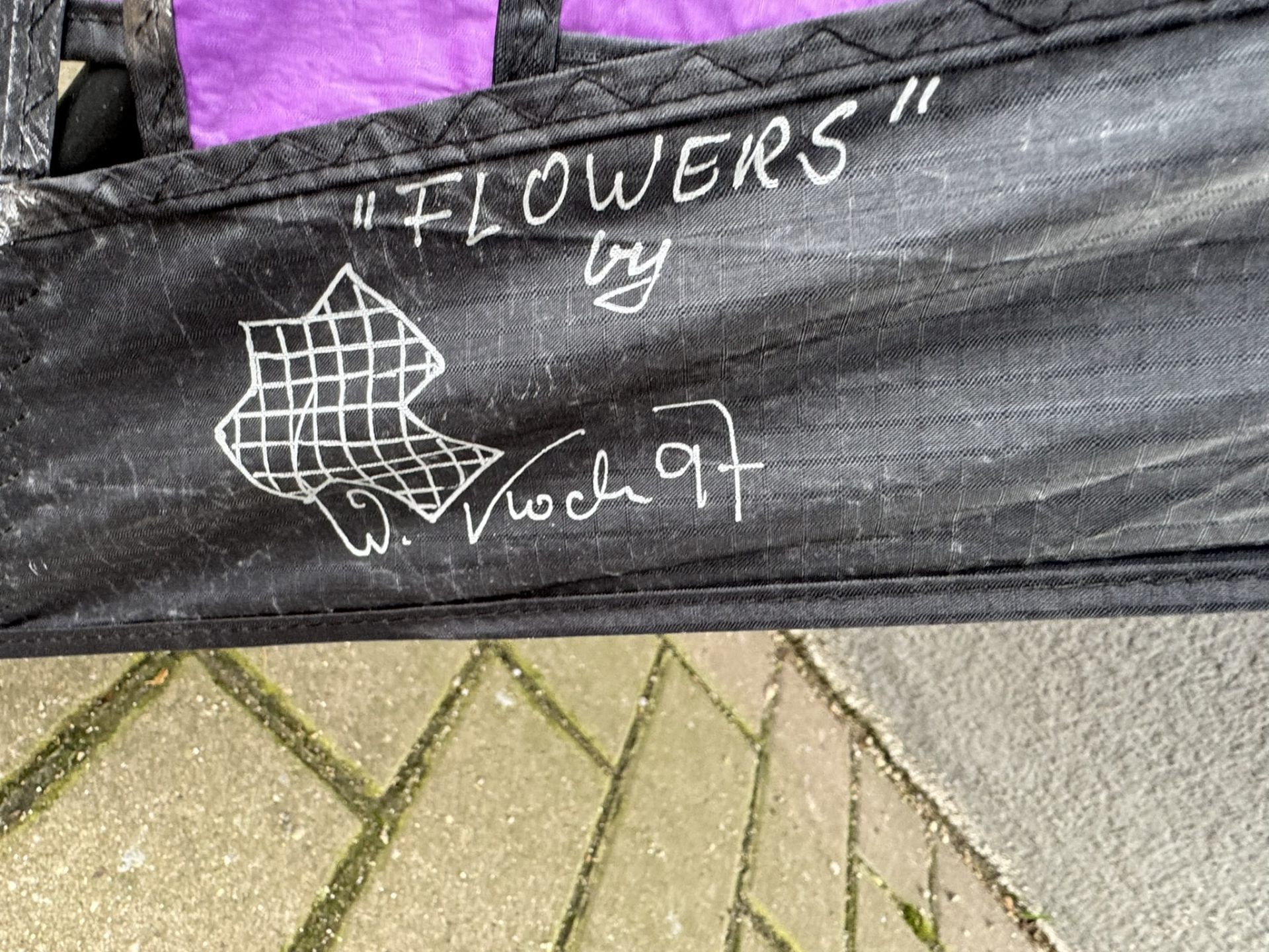 Dieser Sterndrachen stammt von dem renommierten Künstler und Drachenbauer Willi Koch (11.06.1939–27.10.2019), dessen Name untrennbar mit höchster handwerklicher Präzision und künstlerischer Ausdruckskraft im Drachenbau verbunden ist. Koch gilt als Erfinder der innovativen Streifentechnik, die seine Werke bis heute einzigartig macht. Jeder seiner in Handarbeit gefertigten Drachen ist ein unverwechselbares Einzelstück, geprägt von Kreativität, technischem Feingefühl und einem außergewöhnlichen Qualitätsanspruch. Der Sterndrachen trägt den Titel „Flowers“, wurde im Jahr 1997 gefertigt und von Willi Koch mit dem charakteristischen Kimono-Signet, dem Baujahr sowie seiner handschriftlichen Signatur versehen – ein Markenzeichen, das die Echtheit seiner Originalarbeiten bestätigt. Mit einer imposanten Höhe von 3,16 Metern und einer Breite von 2,77 Metern beeindruckt der Drachen nicht nur durch seine Größe, sondern auch durch sein kunstvolles Design: In filigraner Streifenarbeit entsteht ein sternförmiges Muster, das eine florale Komposition aus blauen Blüten und kräftigen grünen Blättern umrahmt. Die farblich abgestimmten, mosaikartigen Elemente in Violett und Silber verleihen dem Drachen zusätzliche Tiefe und Struktur. Im Gegensatz zu industriell gefertigten Serienmodellen im Willi-Koch-Design, wie sie etwa von Premier Kites produziert werden, steht dieser handgearbeitete Sterndrachen für Kochs persönliche Sorgfalt, seine gestalterische Handschrift und die hohe Kunst des traditionellen Drachenbaus. Jede Naht, jede Linie und jedes Farbdetail spiegelt die Hingabe eines Künstlers wider, dessen Werke heute sowohl fliegerisch als auch kunsthistorisch geschätzt werden.