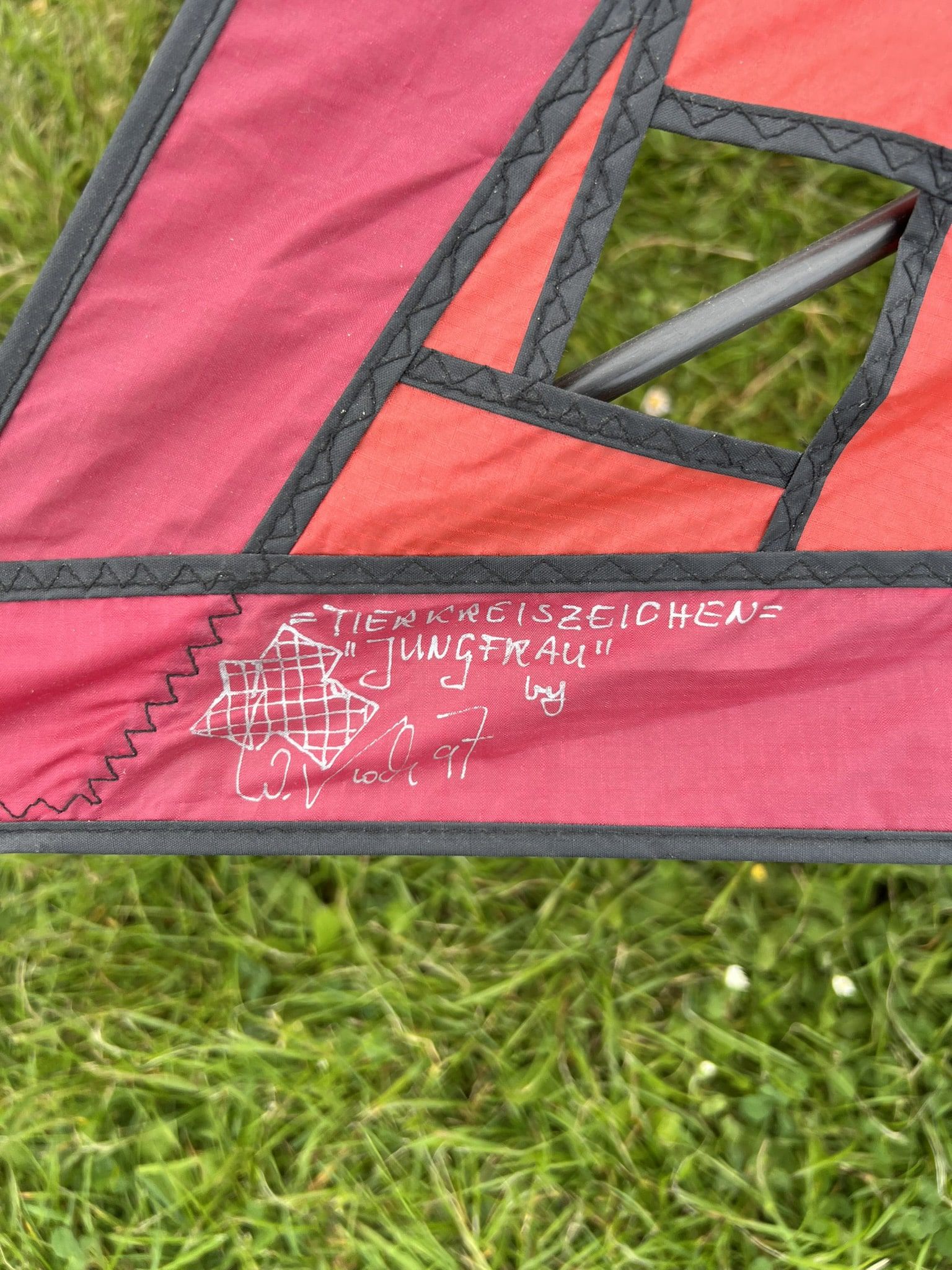 Tierkreis-Sterne – Stern-Drachen von Willi Koch Künstler: Willi Koch Willi Koch (1932–2015) war ein deutscher Drachenbauer und Grafiker, der als einer der einflussreichsten Pioniere der europäischen Drachenkunst gilt. Seine Drachen waren nicht nur Flugobjekte, sondern erzählerische Kunstwerke – stets klar in der Formensprache, stark in Symbolik und oft inspiriert von Mythologie, Religion oder Märchen. Koch entwarf viele Unikate, die auf Drachenfesten weltweit gezeigt wurden. Eines seiner bekanntesten Projekte ist die Serie der Tierkreiszeichen-Sterne – eine Sammlung kunstvoll gestalteter Stern-Drachen, von denen jeder ein Sternbild des Tierkreises zeigt. Design & Symbolik Diese Drachen bestehen aus einer präzisen sechszackigen Sternform, deren Innenfläche wie ein Kirchenfenster gestaltet ist. In der Mitte jedes Sterns befindet sich ein handappliziertes Tierkreiszeichen – z. B. Widder, Fische, Wassermann – eingebettet in ein farblich kontrastreiches Mosaikgitter. Die Bildsprache ist klar und grafisch, mit starken Kontrasten und ikonischen Symbolen wie Monden, Sternen oder Planeten. Jeder Stern ist in einer anderen Farbwelt gehalten, was beim Flug in Serie einen eindrucksvollen Regenbogen-Effekt ergibt. Materialien & Technik Größe pro Stern: ca. 1,86 m hoch, 1,6 m breit Segelmaterial: Spinnacker-Ripstop-Nylon (leicht, transluzent, robust) Gestänge: 6 mm und 8 mm Kohlefaserstäbe Technik: Applikation, Rahmenbauweise, feine Nähkunst Verbindung: Die Sterne lassen sich einzeln fliegen oder zu einer Kette (Stack) verbinden Die Drachen sind sorgfältig handgefertigt – jedes Exemplar ist ein kunsthandwerkliches Einzelstück. Bedeutung & Rezeption Willi Kochs Tierkreis-Drachen gelten als Meisterwerke der Himmelsgrafik. Sie verbinden astrologische Motive mit klassischer Fensterästhetik und stehen damit exemplarisch für seine Handschrift: spirituell, dekorativ, flugfähig. Auf internationalen Festivals werden sie bis heute ausgestellt, etwa in Drachenmuseen oder bei Retrospektiven seines Werks. Die Serie ist in Sammlerkreisen hochgeschätzt – nicht zuletzt wegen ihrer klaren Form, Farbharmonie und künstlerischen Konsequenz.