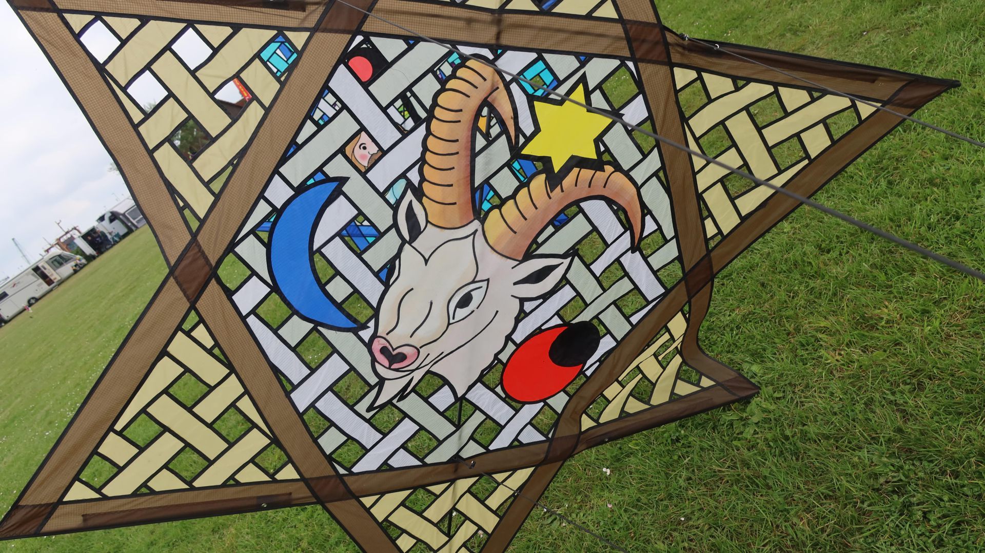 Tierkreis-Sterne – Stern-Drachen von Willi Koch Künstler: Willi Koch Willi Koch (1932–2015) war ein deutscher Drachenbauer und Grafiker, der als einer der einflussreichsten Pioniere der europäischen Drachenkunst gilt. Seine Drachen waren nicht nur Flugobjekte, sondern erzählerische Kunstwerke – stets klar in der Formensprache, stark in Symbolik und oft inspiriert von Mythologie, Religion oder Märchen. Koch entwarf viele Unikate, die auf Drachenfesten weltweit gezeigt wurden. Eines seiner bekanntesten Projekte ist die Serie der Tierkreiszeichen-Sterne – eine Sammlung kunstvoll gestalteter Stern-Drachen, von denen jeder ein Sternbild des Tierkreises zeigt. Design & Symbolik Diese Drachen bestehen aus einer präzisen sechszackigen Sternform, deren Innenfläche wie ein Kirchenfenster gestaltet ist. In der Mitte jedes Sterns befindet sich ein handappliziertes Tierkreiszeichen – z. B. Widder, Fische, Wassermann – eingebettet in ein farblich kontrastreiches Mosaikgitter. Die Bildsprache ist klar und grafisch, mit starken Kontrasten und ikonischen Symbolen wie Monden, Sternen oder Planeten. Jeder Stern ist in einer anderen Farbwelt gehalten, was beim Flug in Serie einen eindrucksvollen Regenbogen-Effekt ergibt. Materialien & Technik Größe pro Stern: ca. 1,86 m hoch, 1,6 m breit Segelmaterial: Spinnacker-Ripstop-Nylon (leicht, transluzent, robust) Gestänge: 6 mm und 8 mm Kohlefaserstäbe Technik: Applikation, Rahmenbauweise, feine Nähkunst Verbindung: Die Sterne lassen sich einzeln fliegen oder zu einer Kette (Stack) verbinden Die Drachen sind sorgfältig handgefertigt – jedes Exemplar ist ein kunsthandwerkliches Einzelstück. Bedeutung & Rezeption Willi Kochs Tierkreis-Drachen gelten als Meisterwerke der Himmelsgrafik. Sie verbinden astrologische Motive mit klassischer Fensterästhetik und stehen damit exemplarisch für seine Handschrift: spirituell, dekorativ, flugfähig. Auf internationalen Festivals werden sie bis heute ausgestellt, etwa in Drachenmuseen oder bei Retrospektiven seines Werks. Die Serie ist in Sammlerkreisen hochgeschätzt – nicht zuletzt wegen ihrer klaren Form, Farbharmonie und künstlerischen Konsequenz.