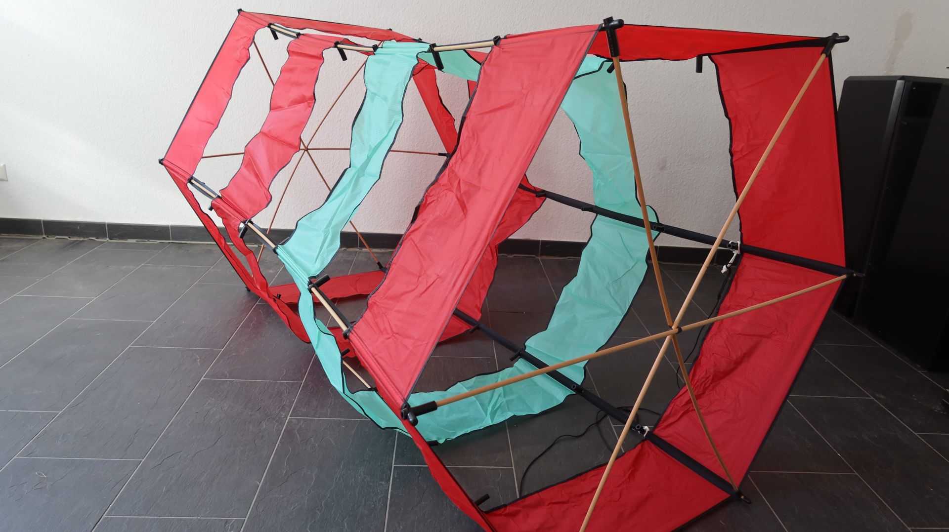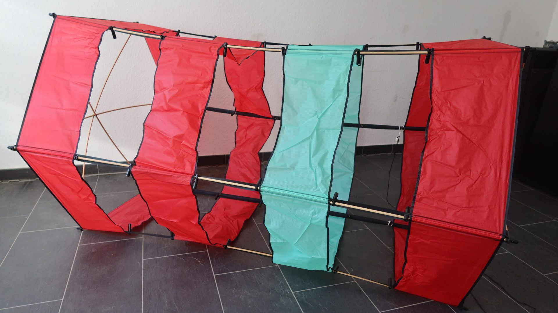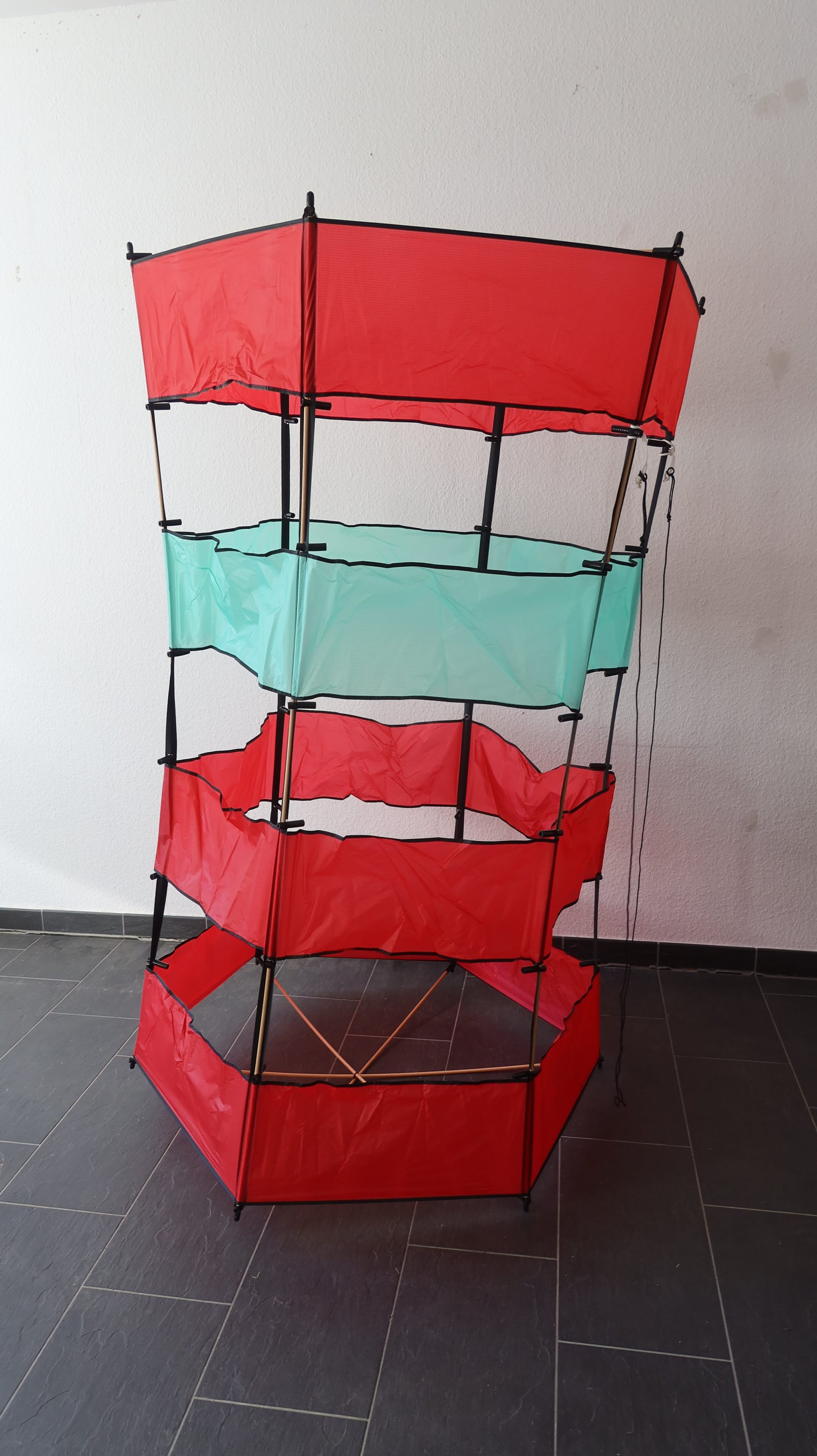 Dieser außergewöhnliche Kastendrachen mit hexagonaler Grundstruktur stammt aus dem Jahr 1998 und wurde von Marc Schnau für „Avantgarde Drachen“ entworfen und handgefertigt. Die Konstruktion aus 8 mm starkem Raminholz und hochwertigem Ripstop-Nylon kombiniert klassische Drachenbauweise mit künstlerischem Anspruch. Die geometrisch präzise, sechseckige Boxform verleiht dem Drachen nicht nur hohe Stabilität bei kräftigem Wind, sondern auch eine beeindruckende visuelle Präsenz, die ihn ideal für Ausstellungen und Drachenfestivals macht. Der Drachen ist handsigniert vom Erbauer und stellt ein charakteristisches Beispiel für die experimentelle Drachenszene der späten 1990er-Jahre dar, in der funktionales Flugobjekt und fliegende Skulptur zunehmend miteinander verschmolzen. Im zusammengelegten Zustand lässt sich der Drachen platzsparend transportieren, während seine auffaltbare Rahmenstruktur ein bemerkenswertes Raumvolumen entfaltet. Ein seltenes, signiertes Sammlerstück mit musealem Potenzial und einem festen Platz in der Geschichte des künstlerischen Drachenbaus.