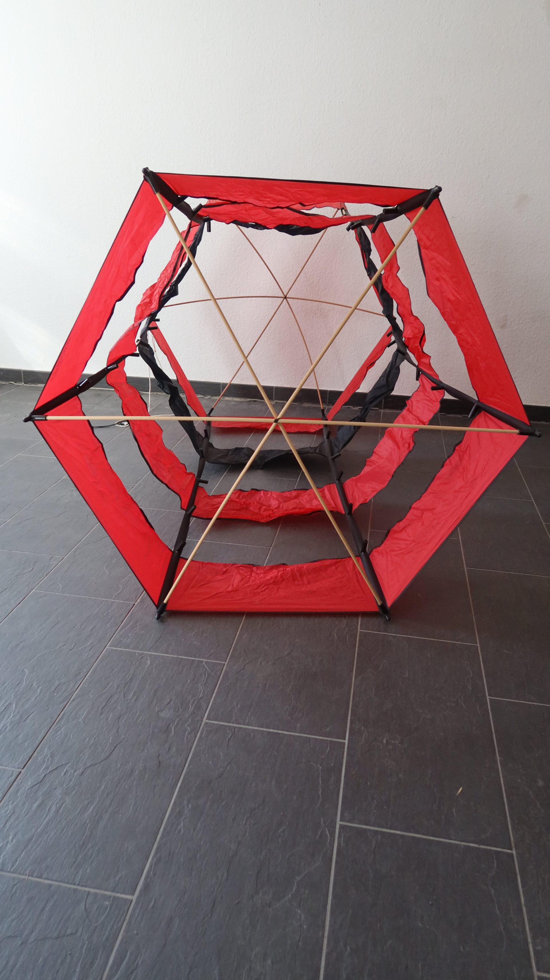 Dieser außergewöhnliche Kastendrachen mit hexagonaler Grundstruktur stammt aus dem Jahr 1998 und wurde von Marc Schnau für „Avantgarde Drachen“ entworfen und handgefertigt. Die Konstruktion aus 8 mm starkem Raminholz und hochwertigem Ripstop-Nylon kombiniert klassische Drachenbauweise mit künstlerischem Anspruch. Die geometrisch präzise, sechseckige Boxform verleiht dem Drachen nicht nur hohe Stabilität bei kräftigem Wind, sondern auch eine beeindruckende visuelle Präsenz, die ihn ideal für Ausstellungen und Drachenfestivals macht. Der Drachen ist handsigniert vom Erbauer und stellt ein charakteristisches Beispiel für die experimentelle Drachenszene der späten 1990er-Jahre dar, in der funktionales Flugobjekt und fliegende Skulptur zunehmend miteinander verschmolzen. Im zusammengelegten Zustand lässt sich der Drachen platzsparend transportieren, während seine auffaltbare Rahmenstruktur ein bemerkenswertes Raumvolumen entfaltet. Ein seltenes, signiertes Sammlerstück mit musealem Potenzial und einem festen Platz in der Geschichte des künstlerischen Drachenbaus.