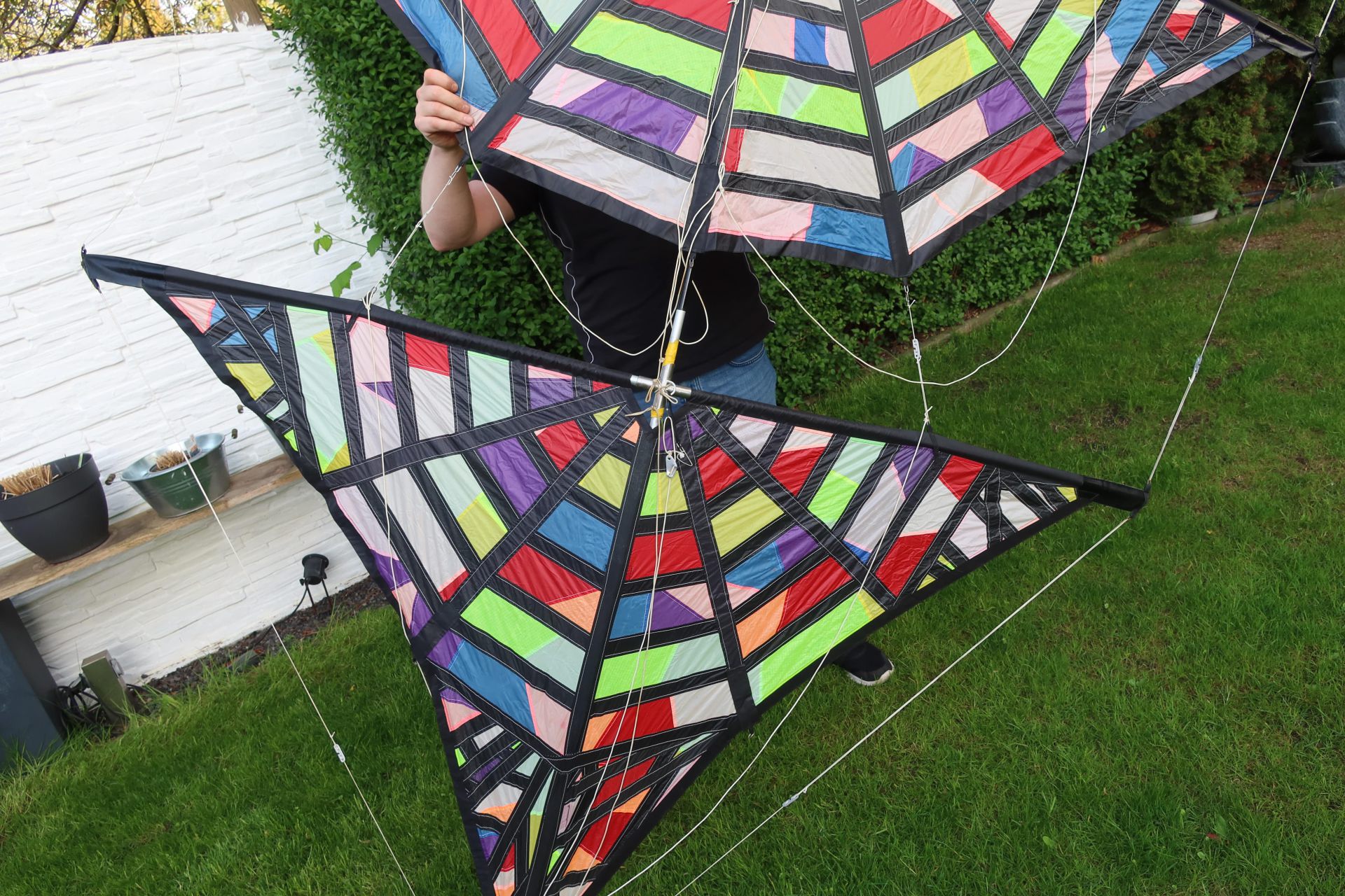 Yvonne de Mille ist eine international bekannte Drachenkünstlerin aus Ōtaki, Neuseeland. Ihre Spezialität: großformatige, farbenprächtige Windskulpturen, die Kunst und traditionelles Drachenhandwerk verbinden. Charlotte’s Web ist eines ihrer eindrucksvollsten Werke – ein farbenfroher Großdrachen mit einer symbolhaften Netzstruktur, inspiriert vom gleichnamigen Kinderbuchklassiker. Der Drachen misst 3,9 m Höhe und 2,8 m Breite. Die Bespannung besteht aus Spinnacker-Ripstop-Nylon, das zu einem mosaikartigen, radialsymmetrischen Muster vernäht wurde. Die vielfarbigen Paneele sind von schwarzen Streifen eingefasst, wodurch ein leuchtender Fensterrosen-Effekt entsteht – ein Markenzeichen vieler Werke von de Mille. Das Gestänge besteht aus 13 mm Glasfaserstäben, verbunden durch robuste Metallstücke, wie sie bei großen Showdrachen üblich sind. Charlotte’s Web ist ein mehrflächiger Einleinerdrachen, aufgebaut in einer sternförmig gegliederten Struktur mit mehreren horizontalen und diagonalen Segelarmen. Die ausgeklügelte Mehrpunkt-Waage ermöglicht eine stabile, steile Fluglage. Trotz seiner Größe bleibt der Drachen überraschend leicht und gut beherrschbar – auch bei mittleren Winden (ab ca. 2 Bft). Das Design verteilt Winddruck effizient, wodurch der Drachen auch bei böigem Wetter ruhig fliegt. De Mille versteht ihre Drachen als „fliegende Bilder“: Charlotte’s Web ist nicht nur ein Flugobjekt, sondern eine bewegte Lichtskulptur, die sich im Sonnenlicht verwandelt. Sie ist ein herausragendes Beispiel für Windkunst – ästhetisch, technisch anspruchsvoll und emotional wirkungsvoll. Charlotte’s Web ist ein Einzelstück. Der Drachen steht exemplarisch für eine neue Generation künstlerischer Drachen, die nicht nur fliegen, sondern erzählen und staunen lassen.