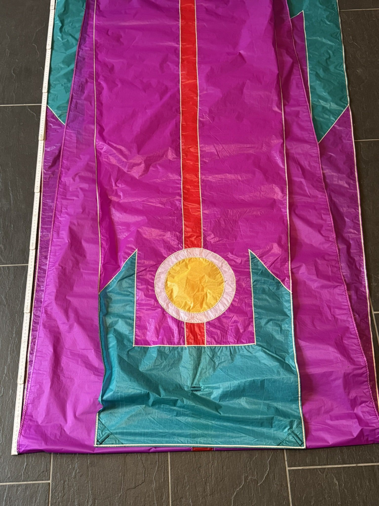 Der „Della Porta“ ist ein eindrucksvoller Einleiner-Drachen in klassischer Rechteckform, inspiriert vom historischen Drachenmodell des Renaissancegelehrten Giambattista della Porta. Mit seiner markanten, geometrischen Gestaltung und der kraftvollen Farbgebung in Violett, Türkis, Gelb und Rot vereint dieser Drachen ästhetische Raffinesse mit funktionaler Stabilität. Die Segelfläche besteht aus hochwertigem, leichtem Spinnaker-Nylon und ist mit einem stabilen Kreuzgestänge aus Kohlefaser ausgestattet, das für einen zuverlässigen und ruhigen Flug sorgt. Ein besonderes Merkmal des „Della Porta“ ist sein appliziertes Reflexband, das ihn auch bei Nachtflügen sichtbar macht. Dieses reflektierende Element verleiht dem Drachen bei Dunkelheit eine faszinierende, leuchtende Präsenz am Himmel. Der lange, farblich abgestimmte Schweif unterstützt die Flugstabilität und unterstreicht die eindrucksvolle Erscheinung des Drachen in Bewegung. Dank seiner robusten Bauweise, dem präzisen Zugsystem und der durchdachten Ausstattung ist der „Della Porta“ sowohl für kulturelle Veranstaltungen und Drachenfeste als auch für den ambitionierten Freizeitflug ideal geeignet. Er verbindet historische Wurzeln mit moderner Funktionalität und ist ein echter Blickfang – bei Tag und bei Nacht.