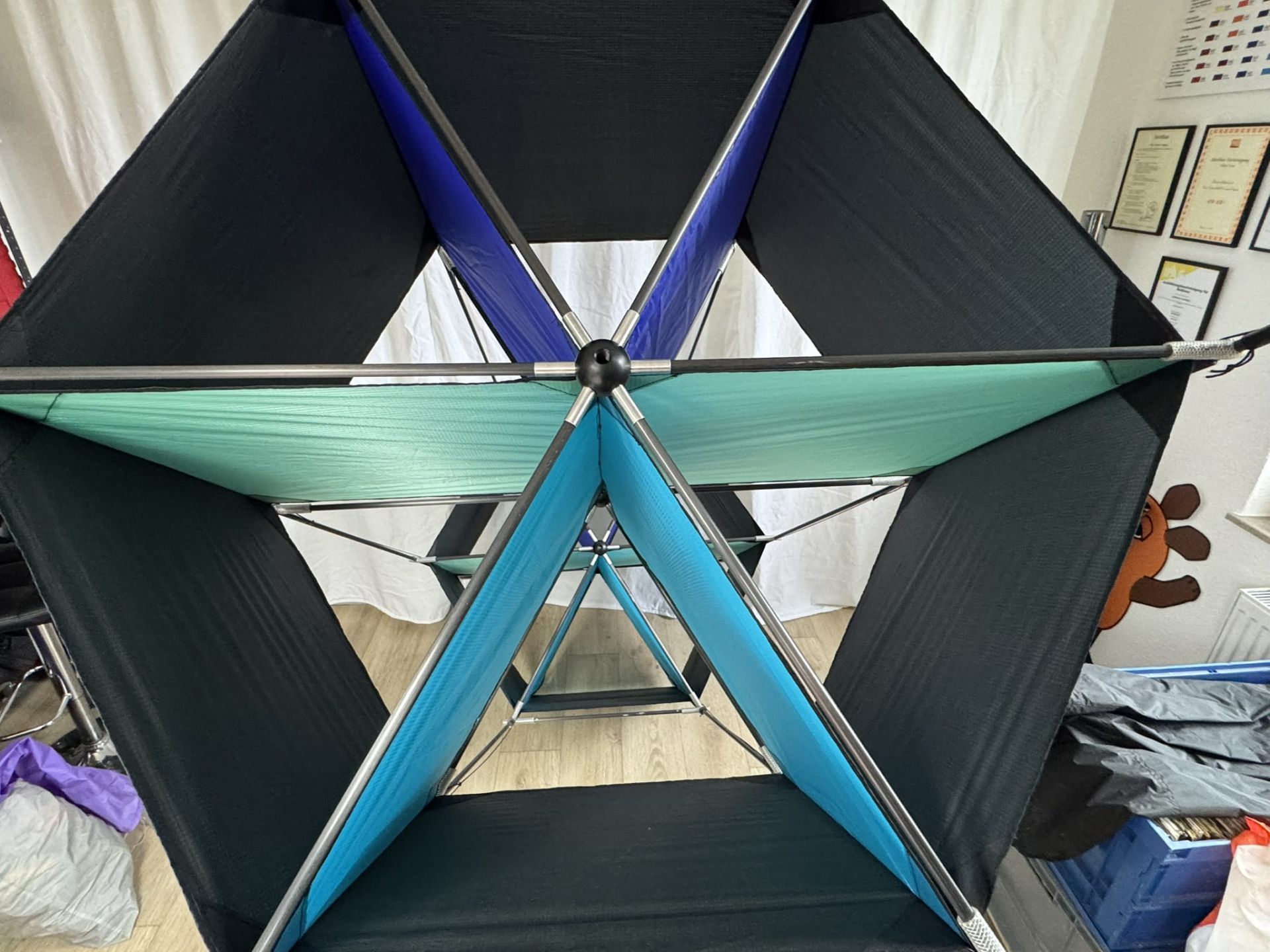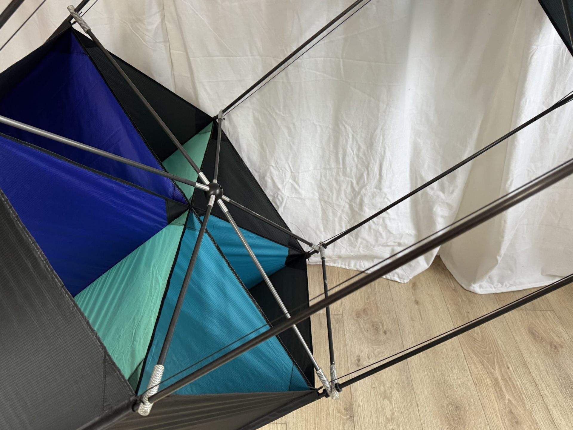 Der angebotene Kastendrachen ist eine außergewöhnliche Einzelanfertigung vermutlich aus der Werkstatt CUT Kite in Göttingen und stellt ein technisches High-End-Produkt der 1990er Jahre dar. Die Konstruktion misst ca. 205 cm x 110 cm x 90 cm und besteht aus hochwertigem Spinnackernylon in der Farbkombination Schwarz, Blau, Mint und Türkis. Die tragende Struktur ist mit 10 mm CFK-Rohren (25 lfdm.) ausgestattet, die über speziell gefertigte Kreuzverbinder aus Kunststoff und Aluminium form- und belastungssicher verbunden sind. Das Modell befindet sich in einem neuwertigen Zustand, wurde nie geflogen und ausschließlich in Ausstellungen präsentiert. Damit eignet sich dieses Stück sowohl für Sammler als auch für technisch interessierte Drachenbauer, die eine seltene Kastendrachen-Variante mit präziser Verarbeitung, Material-Know-how und hohem gestalterischen Anspruch suchen.