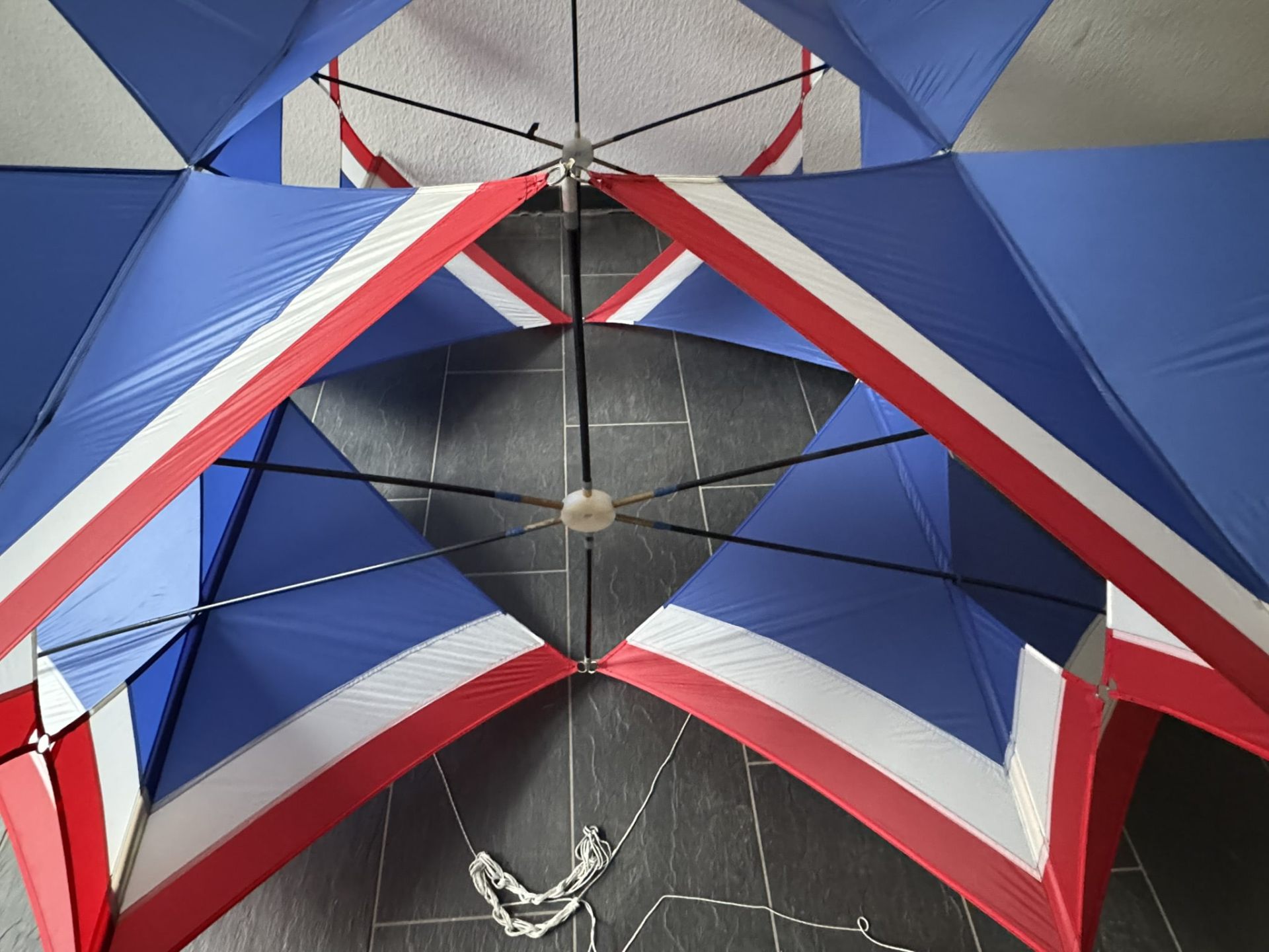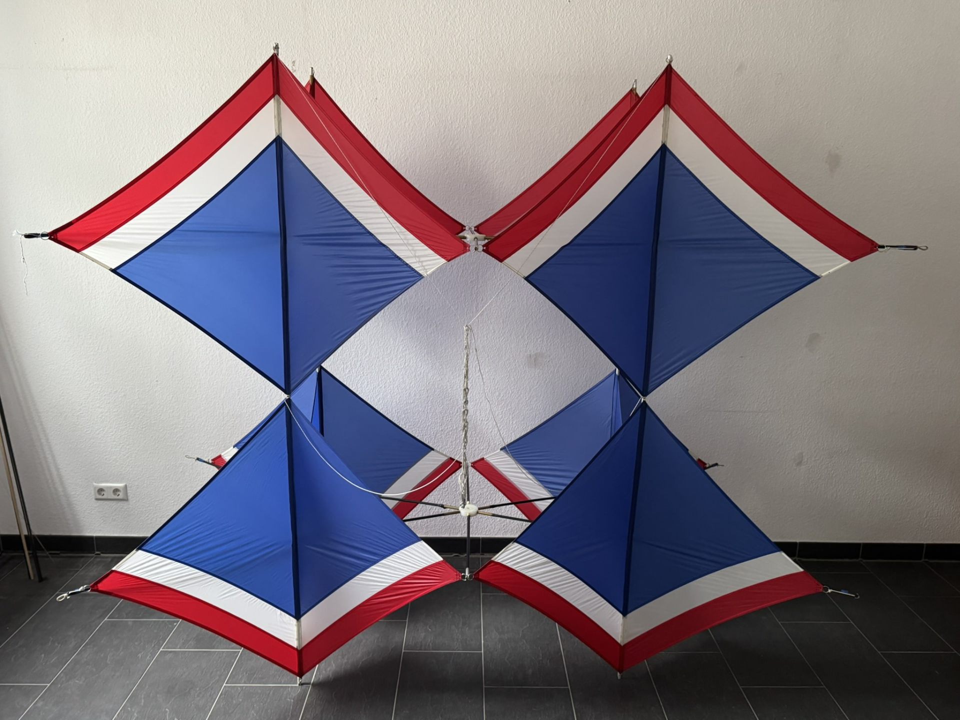 Dieser außergewöhnliche Kastendrachen wurde am 15. September 1991 von Werner Ahlgrim (*21.05.1922 †01.03.2016) gefertigt – einer prägenden Persönlichkeit der deutschen Drachenfliegerszene. In sorgfältiger Handarbeit entstand ein geometrisch klar strukturierter Zellenverbund, bestehend aus vier raumgreifend angeordneten Modulen, die in ihrer Konstruktion sowohl Stabilität als auch ästhetische Raffinesse vereinen. Die markante Farbgebung in Blau, Weiß und Rot orientiert sich an den Landesfarben von Schleswig-Holstein und verleiht dem Drachen eine klare visuelle Identität. Das Modell ist als Einzelstück mit einer persönlichen Widmung versehen: „Für meine Kieler Drachenfreunde – 15.09.1991“. Diese Geste unterstreicht den engen, freundschaftlichen Charakter der Drachenbau- und Fliegerszene jener Zeit, in der Drachen nicht nur als Flugobjekte, sondern als Zeichen kreativer Gemeinschaft verstanden wurden. Ahlgrims Arbeit ist geprägt von technischem Verständnis, künstlerischem Anspruch und einem tiefen Gespür für aerodynamisches Verhalten. Dieses Exemplar steht exemplarisch für seinen Stil und seine Philosophie – ein flugfähiges Kunstwerk und zugleich ein historisches Zeugnis lebendiger Drachentradition.