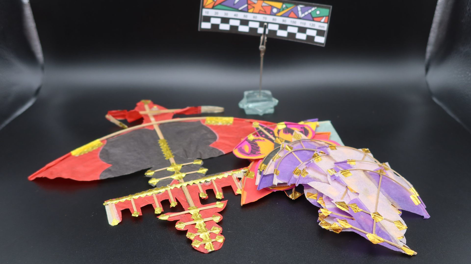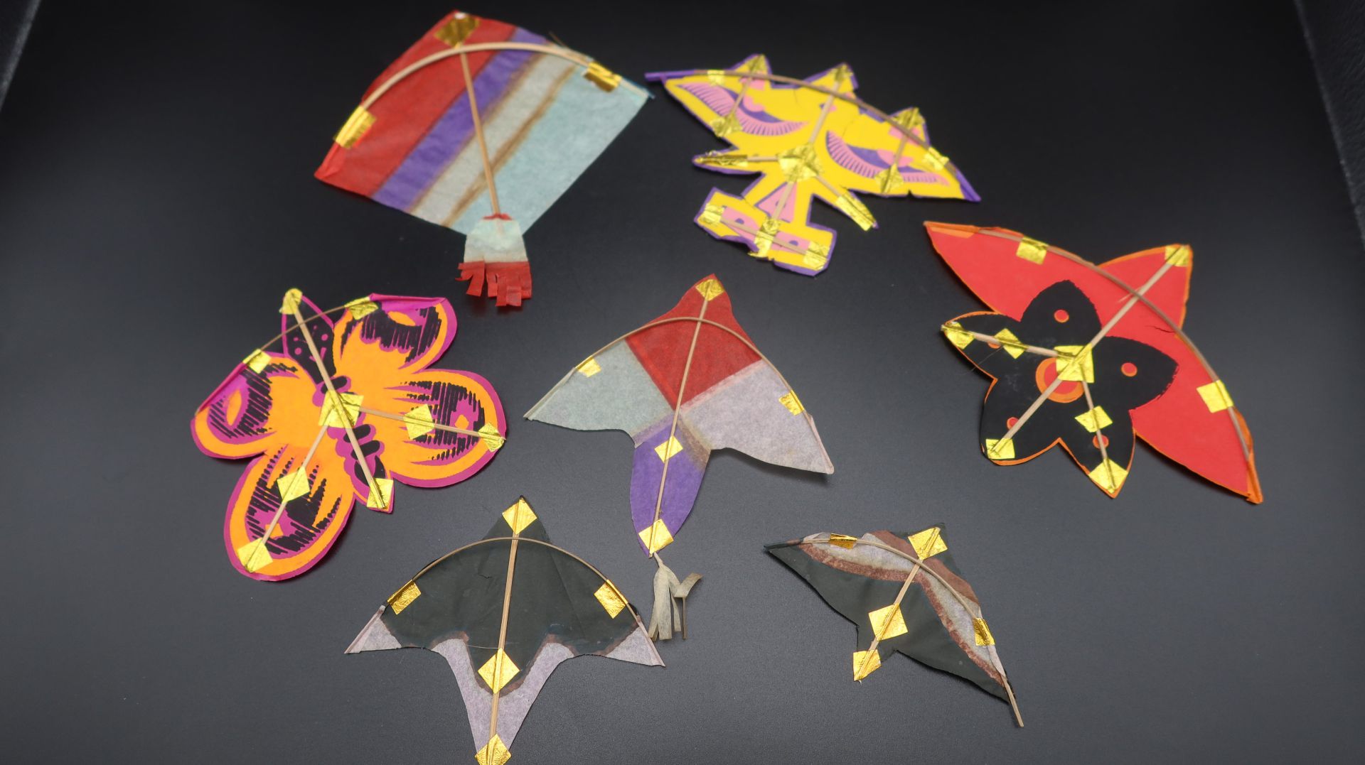 Diese Sammlung besteht aus handgefertigten Miniatur-Kampfdrachen aus Indien, die eine faszinierende Vielfalt traditioneller Formen, Farben und symbolischer Gestaltungselemente repräsentieren. Jeder Drachen wurde aus hauchdünnem, farbigem Papier gefertigt und auf einem feinen Bambusrahmen gespannt – eine Technik, die tief in der indischen Handwerkstradition verwurzelt ist. Die Miniaturen zeigen stilisierte Varianten klassischer „Patang“-Kampfdrachen, wie sie insbesondere während großer Drachenfeste wie Makar Sankranti oder Basant Panchami zum Einsatz kommen. Auffällig sind die reich verzierten Oberflächen mit applizierten Goldfoliendetails an den Verbindungsstellen und Kanten, die nicht nur der Stabilisierung dienen, sondern auch dekorative Akzente setzen. Die Farbpalette reicht von kräftigem Rot, Gelb und Lila bis hin zu Schwarz- und Naturtönen, häufig in geometrischen oder figürlichen Mustern arrangiert. Neben der klassischen Diamantform finden sich in dieser Serie auch kunstvoll ausgearbeitete Varianten in Form von Vögeln, Schmetterlingen und floralen Symbolen – ein Hinweis auf die große Bedeutung von Natur und Spiritualität im indischen Kunsthandwerk. Die Miniaturgröße dieser Drachen legt nahe, dass sie nicht für den Flug gedacht sind, sondern vielmehr als dekorative Objekte oder Sammlerstücke fungieren. Ihre sorgfältige Verarbeitung und die Detailfreude machen sie zu eindrucksvollen Zeugnissen einer lebendigen Drachenkultur, in der Technik, Spiel und symbolische Aussage kunstvoll miteinander verschmelzen. Solche Miniaturen werden häufig als Erinnerungsstücke an Drachenfeste verkauft oder dienen als kulturelle Botschafter für ein traditionsreiches Handwerk, das bis heute gepflegt und weitergegeben wird. Miniaturdrachen ca. 8 x 9 cm / ca. 9 x 9 cm / ca. 10 x 10 cm, der rot schwarze ca. 25 x 25 cm,