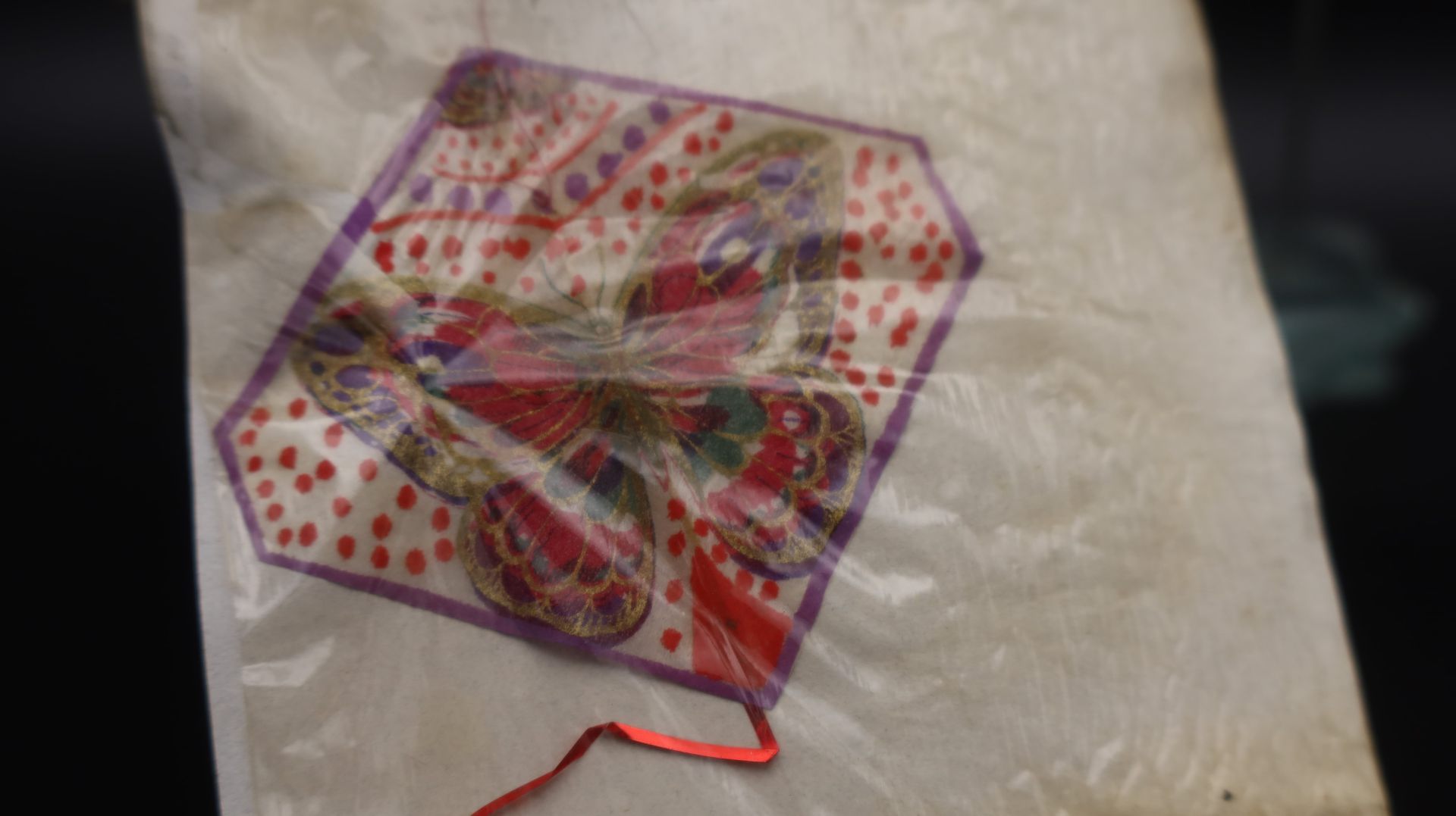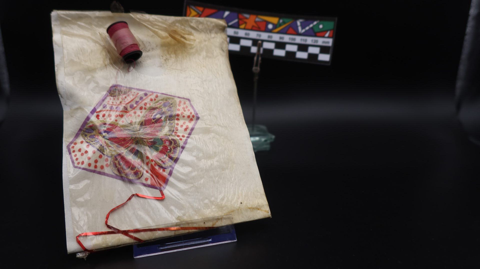 Dieser Miniaturdrachen ist Teil der Serie The Itsy Bitsy Kite des Herstellers Kite Sails aus Colorado Springs. Das Objekt misst 80 mm x 80 mm und ist aus dünnem, leicht transparentem Papier oder Kunststofffolie gefertigt. Die Vorderseite ziert ein farbenfrohes Schmetterlingsmotiv, das in einem sechseckigen Rahmen gestaltet ist. Die Farbgebung besteht überwiegend aus Rot-, Violett- und Goldtönen mit dekorativen Punkten im Hintergrund. Der Drachen befindet sich in der originalen Verkaufsverpackung, die neben dem Drachen selbst auch eine kleine Spule mit rotem Nylongarn sowie einen rot glänzenden Plastikschweif enthält. Auf der Verpackung sind humorvoll formulierte Anweisungen zum Drachensteigen abgedruckt, die den unkomplizierten und spielerischen Charakter des Produkts unterstreichen. Der Werbeslogan lautet: „Easy to fly! Fun indoors or outdoors! Great for all ages!“ Das Objekt ist ein typisches Beispiel für sogenannte Taschen- oder Fingerdrachen, die in den 1980er- und 1990er-Jahren als Mitbringsel oder humorvolles Geschenk beliebt waren. Trotz leichter Alterungsspuren wie Verfärbungen und Knicke weist der Drachen einen guten Erhaltungszustand auf. Er dokumentiert eine verspielte Facette der populären Freizeitkultur und Miniaturspielzeuggestaltung jener Zeit.