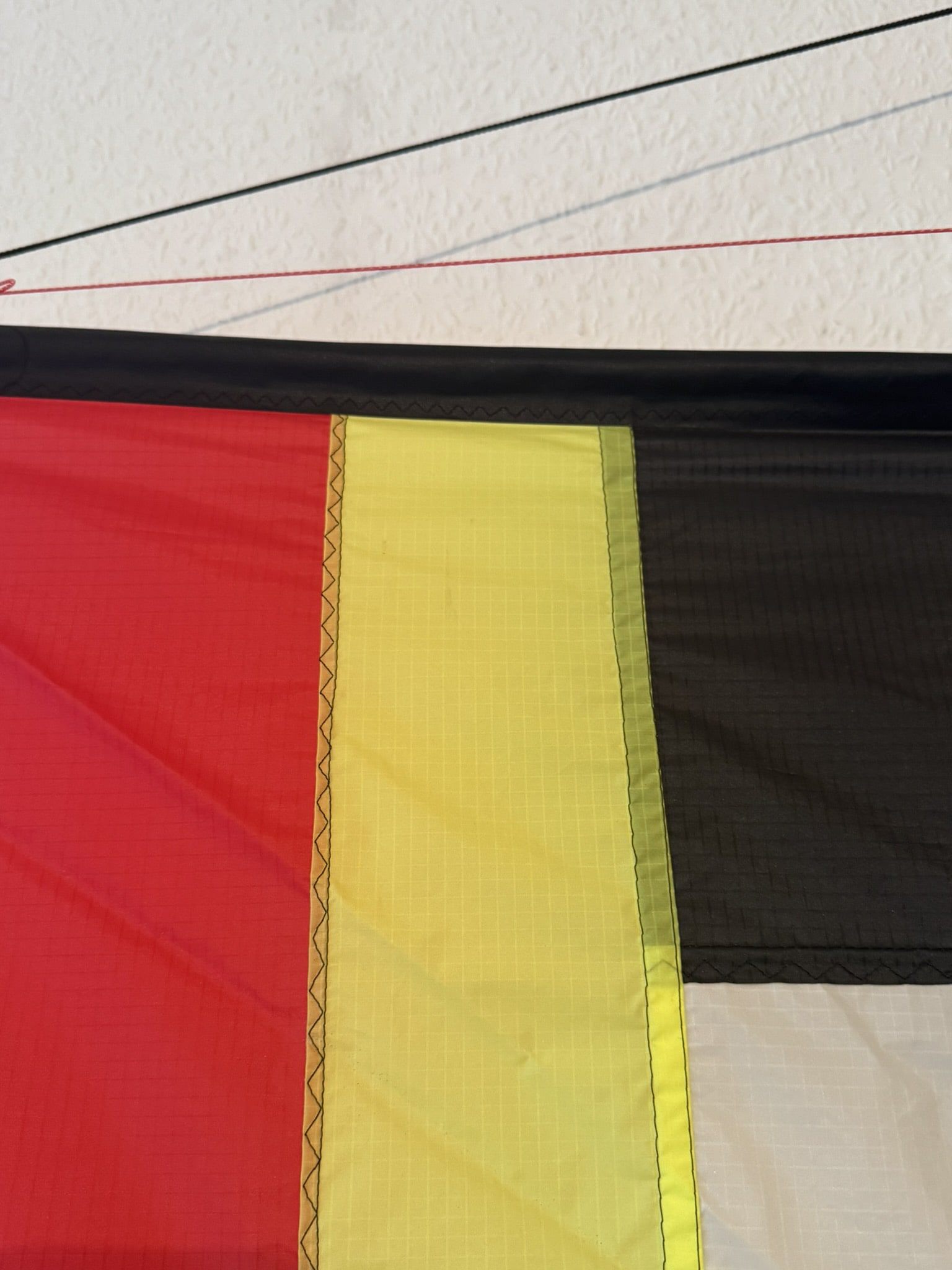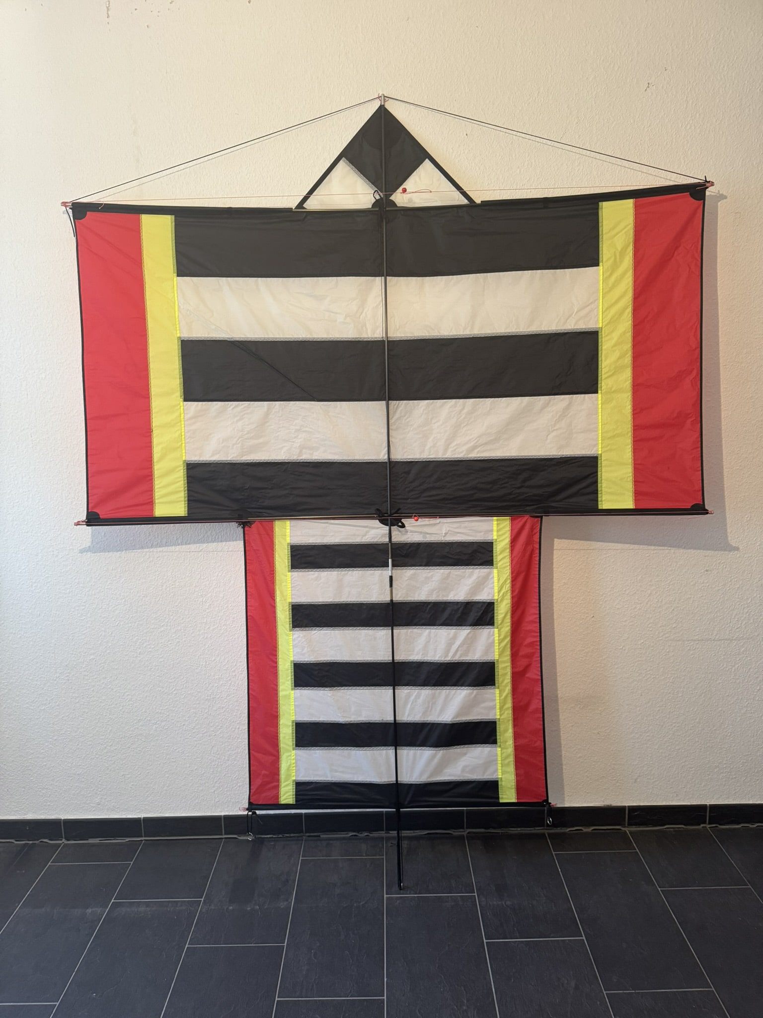 Dieses außergewöhnliche Leichtbau-Unikat vereint die traditionelle Formensprache des japanischen Sode Dako mit innovativen Materialien der modernen Konstruktionskunst. Gefertigt aus hochwertigem Spinnaker-Nylon, besticht der Kite durch seine beeindruckende Leichtigkeit und Widerstandsfähigkeit. Die markante rechteckige Struktur wird durch ein präzise verarbeitetes CFK-Gestänge gestützt, das nicht nur für Stabilität sorgt, sondern auch ein dynamisches Flugverhalten ermöglicht. Die kontrastreiche Gestaltung in Schwarz, Weiß, Rot und Gelb verleiht dem Kite eine kraftvolle optische Präsenz, die sich sowohl am Boden als auch in der Luft eindrucksvoll entfaltet. Die klare Linienführung der horizontalen Streifen wird durch die vertikalen Akzente in Rot und Gelb harmonisch ergänzt, wodurch der Kite eine unverwechselbare, fast grafische Ästhetik erhält. Ob als Blickfang am Himmel oder als dekoratives Kunstobjekt – dieses handgefertigte Einzelstück vereint traditionelle Handwerkskunst mit modernem Design. Es ist nicht nur ein Fluggerät, sondern auch ein Ausdruck von Leichtigkeit, Freiheit und Präzision. Ein Unikat, das die Kunst des Drachenbaus in eine neue Dimension hebt.
