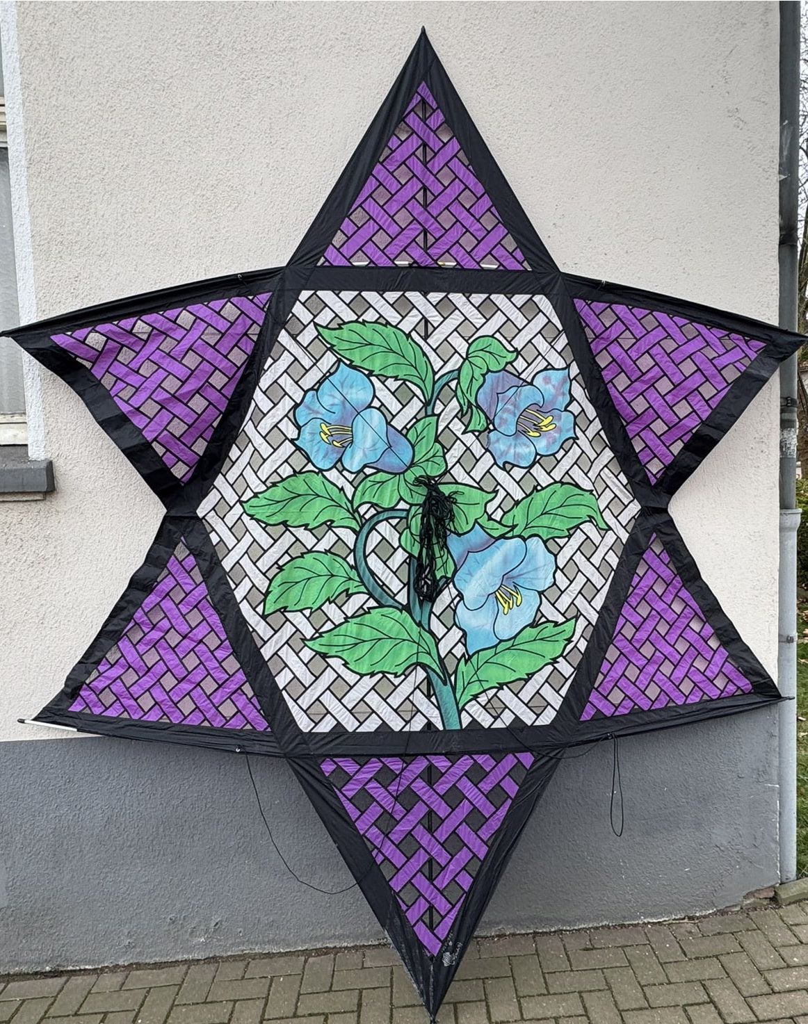 Dieser Sterndrachen stammt von dem renommierten Künstler und Drachenbauer Willi Koch (11.06.1939–27.10.2019), dessen Name untrennbar mit höchster handwerklicher Präzision und künstlerischer Ausdruckskraft im Drachenbau verbunden ist. Koch gilt als Erfinder der innovativen Streifentechnik, die seine Werke bis heute einzigartig macht. Jeder seiner in Handarbeit gefertigten Drachen ist ein unverwechselbares Einzelstück, geprägt von Kreativität, technischem Feingefühl und einem außergewöhnlichen Qualitätsanspruch. Der Sterndrachen trägt den Titel „Flowers“, wurde im Jahr 1997 gefertigt und von Willi Koch mit dem charakteristischen Kimono-Signet, dem Baujahr sowie seiner handschriftlichen Signatur versehen – ein Markenzeichen, das die Echtheit seiner Originalarbeiten bestätigt. Mit einer imposanten Höhe von 3,16 Metern und einer Breite von 2,77 Metern beeindruckt der Drachen nicht nur durch seine Größe, sondern auch durch sein kunstvolles Design: In filigraner Streifenarbeit entsteht ein sternförmiges Muster, das eine florale Komposition aus blauen Blüten und kräftigen grünen Blättern umrahmt. Die farblich abgestimmten, mosaikartigen Elemente in Violett und Silber verleihen dem Drachen zusätzliche Tiefe und Struktur. Im Gegensatz zu industriell gefertigten Serienmodellen im Willi-Koch-Design, wie sie etwa von Premier Kites produziert werden, steht dieser handgearbeitete Sterndrachen für Kochs persönliche Sorgfalt, seine gestalterische Handschrift und die hohe Kunst des traditionellen Drachenbaus. Jede Naht, jede Linie und jedes Farbdetail spiegelt die Hingabe eines Künstlers wider, dessen Werke heute sowohl fliegerisch als auch kunsthistorisch geschätzt werden.