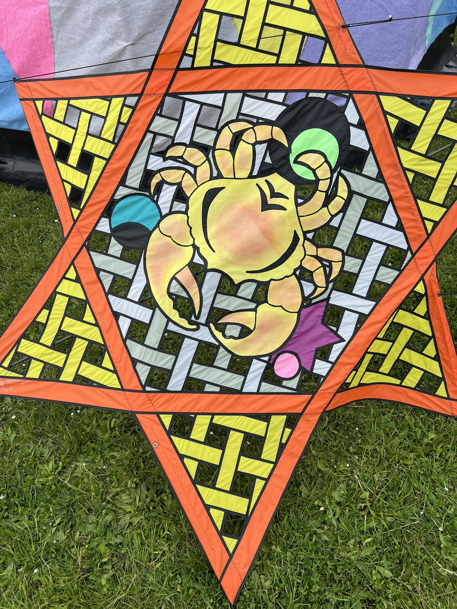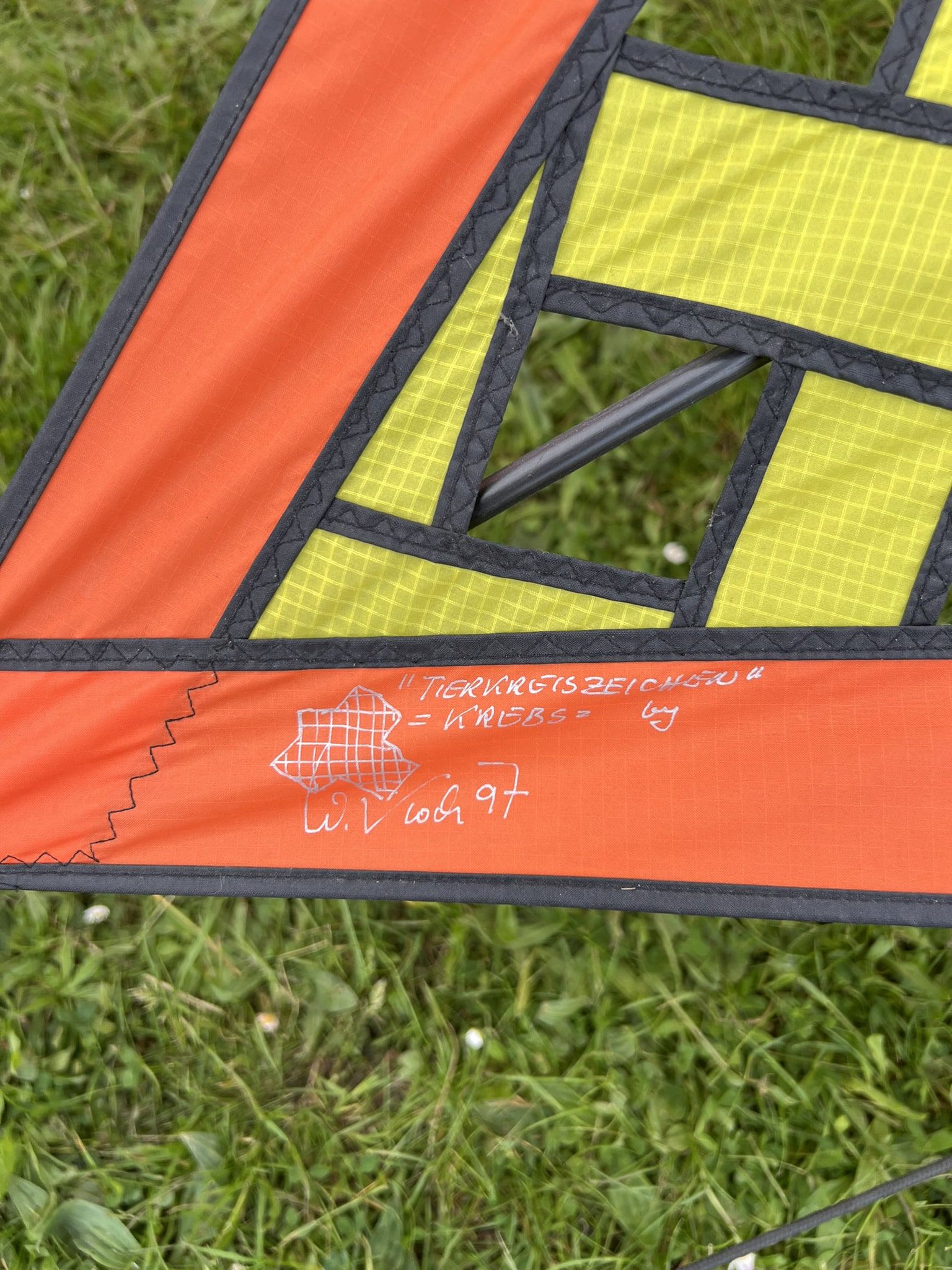 Tierkreis-Sterne – Stern-Drachen von Willi Koch Künstler: Willi Koch Willi Koch (1932–2015) war ein deutscher Drachenbauer und Grafiker, der als einer der einflussreichsten Pioniere der europäischen Drachenkunst gilt. Seine Drachen waren nicht nur Flugobjekte, sondern erzählerische Kunstwerke – stets klar in der Formensprache, stark in Symbolik und oft inspiriert von Mythologie, Religion oder Märchen. Koch entwarf viele Unikate, die auf Drachenfesten weltweit gezeigt wurden. Eines seiner bekanntesten Projekte ist die Serie der Tierkreiszeichen-Sterne – eine Sammlung kunstvoll gestalteter Stern-Drachen, von denen jeder ein Sternbild des Tierkreises zeigt. Design & Symbolik Diese Drachen bestehen aus einer präzisen sechszackigen Sternform, deren Innenfläche wie ein Kirchenfenster gestaltet ist. In der Mitte jedes Sterns befindet sich ein handappliziertes Tierkreiszeichen – z. B. Widder, Fische, Wassermann – eingebettet in ein farblich kontrastreiches Mosaikgitter. Die Bildsprache ist klar und grafisch, mit starken Kontrasten und ikonischen Symbolen wie Monden, Sternen oder Planeten. Jeder Stern ist in einer anderen Farbwelt gehalten, was beim Flug in Serie einen eindrucksvollen Regenbogen-Effekt ergibt. Materialien & Technik Größe pro Stern: ca. 1,86 m hoch, 1,6 m breit Segelmaterial: Spinnacker-Ripstop-Nylon (leicht, transluzent, robust) Gestänge: 6 mm und 8 mm Kohlefaserstäbe Technik: Applikation, Rahmenbauweise, feine Nähkunst Verbindung: Die Sterne lassen sich einzeln fliegen oder zu einer Kette (Stack) verbinden Die Drachen sind sorgfältig handgefertigt – jedes Exemplar ist ein kunsthandwerkliches Einzelstück. Bedeutung & Rezeption Willi Kochs Tierkreis-Drachen gelten als Meisterwerke der Himmelsgrafik. Sie verbinden astrologische Motive mit klassischer Fensterästhetik und stehen damit exemplarisch für seine Handschrift: spirituell, dekorativ, flugfähig. Auf internationalen Festivals werden sie bis heute ausgestellt, etwa in Drachenmuseen oder bei Retrospektiven seines Werks. Die Serie ist in Sammlerkreisen hochgeschätzt – nicht zuletzt wegen ihrer klaren Form, Farbharmonie und künstlerischen Konsequenz.