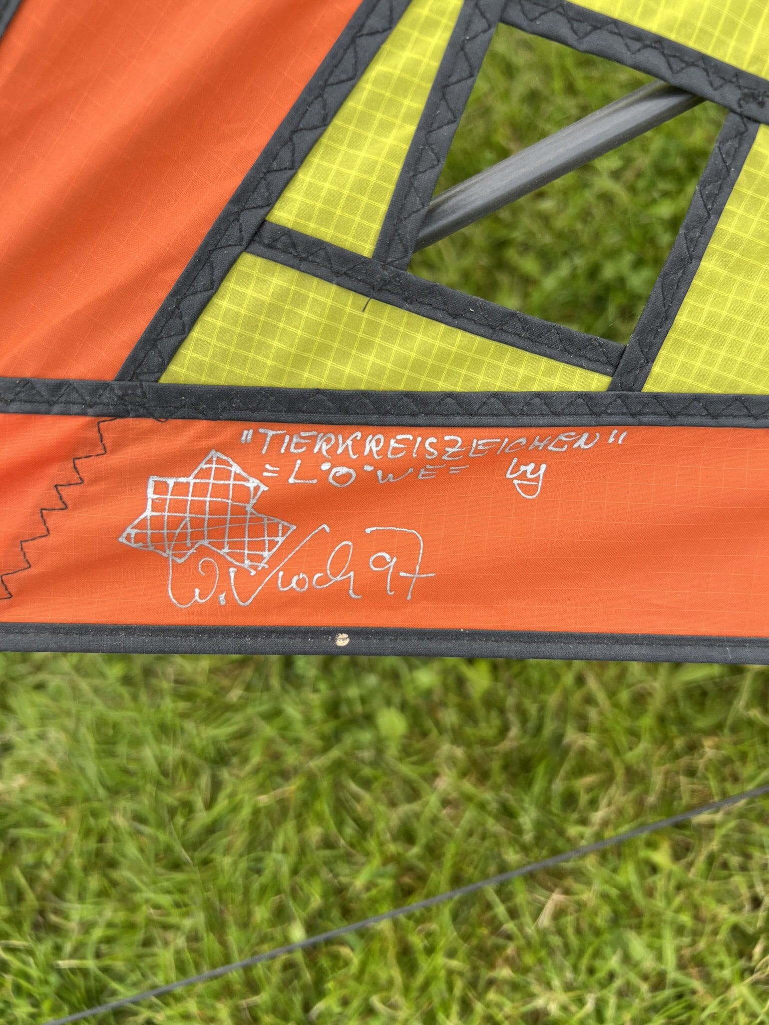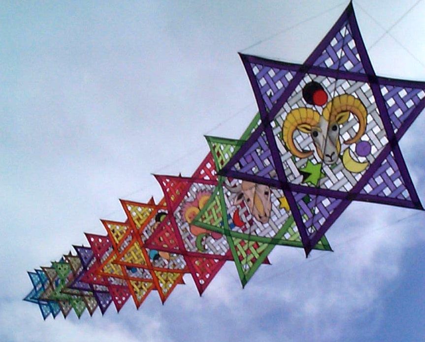 Tierkreis-Sterne – Stern-Drachen von Willi Koch Künstler: Willi Koch Willi Koch (1932–2015) war ein deutscher Drachenbauer und Grafiker, der als einer der einflussreichsten Pioniere der europäischen Drachenkunst gilt. Seine Drachen waren nicht nur Flugobjekte, sondern erzählerische Kunstwerke – stets klar in der Formensprache, stark in Symbolik und oft inspiriert von Mythologie, Religion oder Märchen. Koch entwarf viele Unikate, die auf Drachenfesten weltweit gezeigt wurden. Eines seiner bekanntesten Projekte ist die Serie der Tierkreiszeichen-Sterne – eine Sammlung kunstvoll gestalteter Stern-Drachen, von denen jeder ein Sternbild des Tierkreises zeigt. Design & Symbolik Diese Drachen bestehen aus einer präzisen sechszackigen Sternform, deren Innenfläche wie ein Kirchenfenster gestaltet ist. In der Mitte jedes Sterns befindet sich ein handappliziertes Tierkreiszeichen – z. B. Widder, Fische, Wassermann – eingebettet in ein farblich kontrastreiches Mosaikgitter. Die Bildsprache ist klar und grafisch, mit starken Kontrasten und ikonischen Symbolen wie Monden, Sternen oder Planeten. Jeder Stern ist in einer anderen Farbwelt gehalten, was beim Flug in Serie einen eindrucksvollen Regenbogen-Effekt ergibt. Materialien & Technik Größe pro Stern: ca. 1,86 m hoch, 1,6 m breit Segelmaterial: Spinnacker-Ripstop-Nylon (leicht, transluzent, robust) Gestänge: 6 mm und 8 mm Kohlefaserstäbe Technik: Applikation, Rahmenbauweise, feine Nähkunst Verbindung: Die Sterne lassen sich einzeln fliegen oder zu einer Kette (Stack) verbinden Die Drachen sind sorgfältig handgefertigt – jedes Exemplar ist ein kunsthandwerkliches Einzelstück. Bedeutung & Rezeption Willi Kochs Tierkreis-Drachen gelten als Meisterwerke der Himmelsgrafik. Sie verbinden astrologische Motive mit klassischer Fensterästhetik und stehen damit exemplarisch für seine Handschrift: spirituell, dekorativ, flugfähig. Auf internationalen Festivals werden sie bis heute ausgestellt, etwa in Drachenmuseen oder bei Retrospektiven seines Werks. Die Serie ist in Sammlerkreisen hochgeschätzt – nicht zuletzt wegen ihrer klaren Form, Farbharmonie und künstlerischen Konsequenz.
