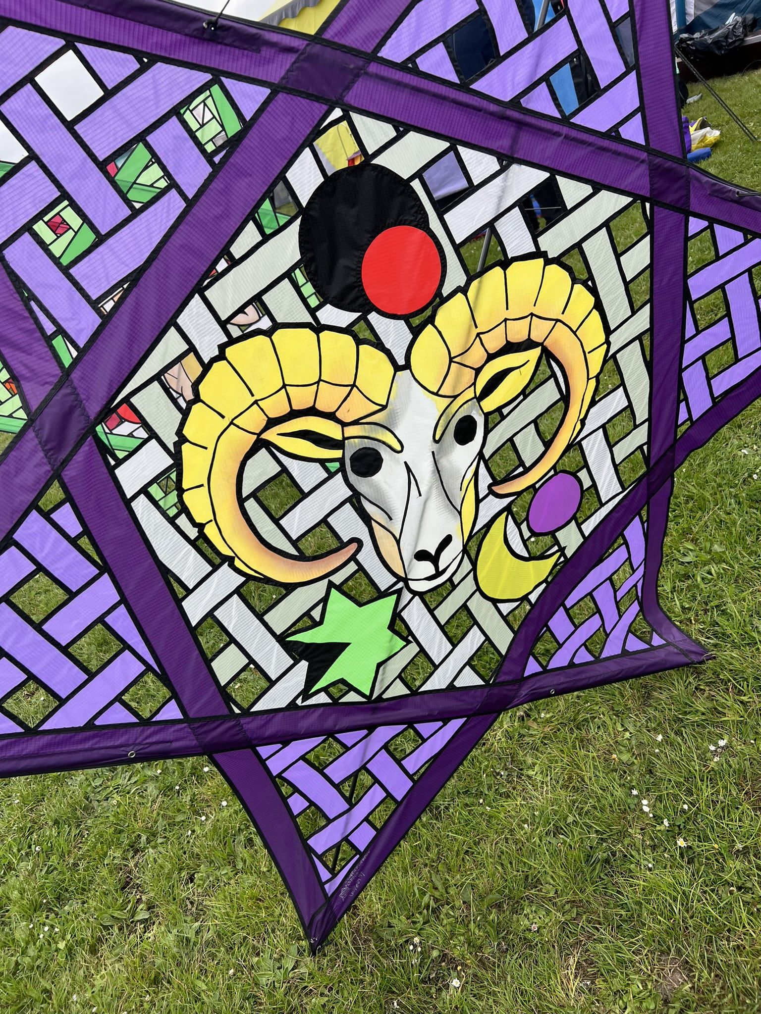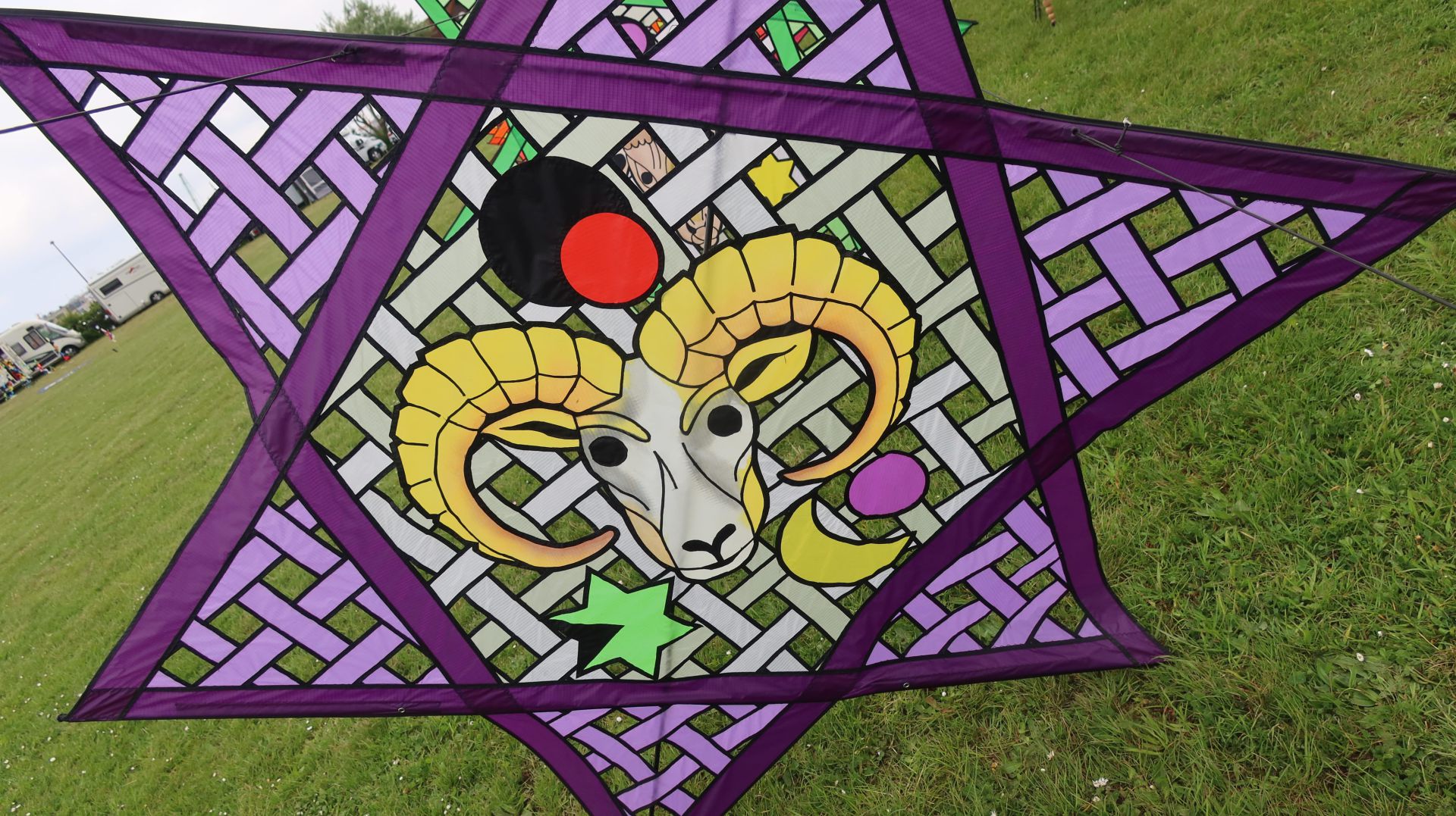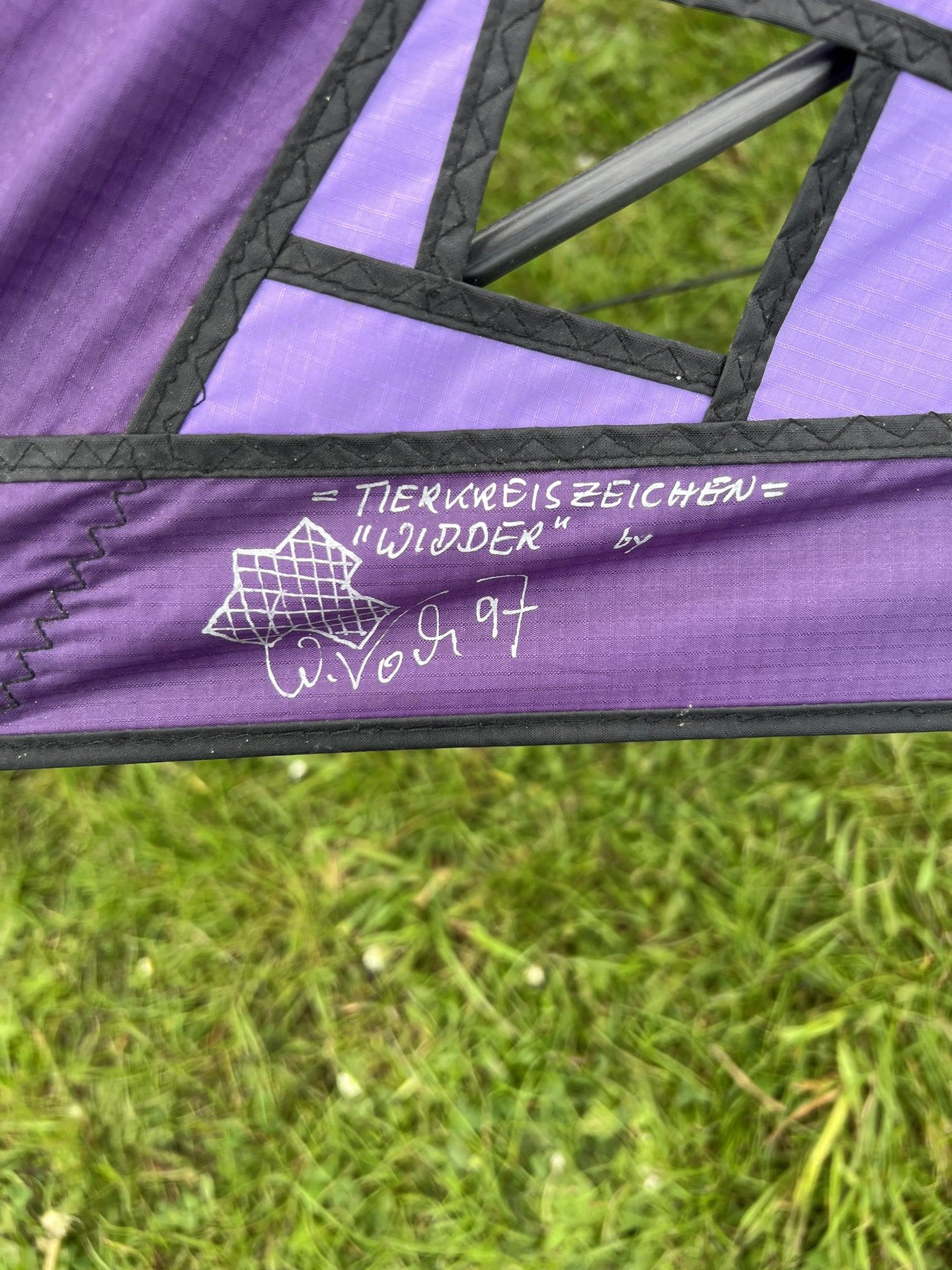 Tierkreis-Sterne – Stern-Drachen von Willi Koch Künstler: Willi Koch Willi Koch (1932–2015) war ein deutscher Drachenbauer und Grafiker, der als einer der einflussreichsten Pioniere der europäischen Drachenkunst gilt. Seine Drachen waren nicht nur Flugobjekte, sondern erzählerische Kunstwerke – stets klar in der Formensprache, stark in Symbolik und oft inspiriert von Mythologie, Religion oder Märchen. Koch entwarf viele Unikate, die auf Drachenfesten weltweit gezeigt wurden. Eines seiner bekanntesten Projekte ist die Serie der Tierkreiszeichen-Sterne – eine Sammlung kunstvoll gestalteter Stern-Drachen, von denen jeder ein Sternbild des Tierkreises zeigt. Design & Symbolik Diese Drachen bestehen aus einer präzisen sechszackigen Sternform, deren Innenfläche wie ein Kirchenfenster gestaltet ist. In der Mitte jedes Sterns befindet sich ein handappliziertes Tierkreiszeichen – z. B. Widder, Fische, Wassermann – eingebettet in ein farblich kontrastreiches Mosaikgitter. Die Bildsprache ist klar und grafisch, mit starken Kontrasten und ikonischen Symbolen wie Monden, Sternen oder Planeten. Jeder Stern ist in einer anderen Farbwelt gehalten, was beim Flug in Serie einen eindrucksvollen Regenbogen-Effekt ergibt. Materialien & Technik Größe pro Stern: ca. 1,86 m hoch, 1,6 m breit Segelmaterial: Spinnacker-Ripstop-Nylon (leicht, transluzent, robust) Gestänge: 6 mm und 8 mm Kohlefaserstäbe Technik: Applikation, Rahmenbauweise, feine Nähkunst Verbindung: Die Sterne lassen sich einzeln fliegen oder zu einer Kette (Stack) verbinden Die Drachen sind sorgfältig handgefertigt – jedes Exemplar ist ein kunsthandwerkliches Einzelstück. Bedeutung & Rezeption Willi Kochs Tierkreis-Drachen gelten als Meisterwerke der Himmelsgrafik. Sie verbinden astrologische Motive mit klassischer Fensterästhetik und stehen damit exemplarisch für seine Handschrift: spirituell, dekorativ, flugfähig. Auf internationalen Festivals werden sie bis heute ausgestellt, etwa in Drachenmuseen oder bei Retrospektiven seines Werks. Die Serie ist in Sammlerkreisen hochgeschätzt – nicht zuletzt wegen ihrer klaren Form, Farbharmonie und künstlerischen Konsequenz.