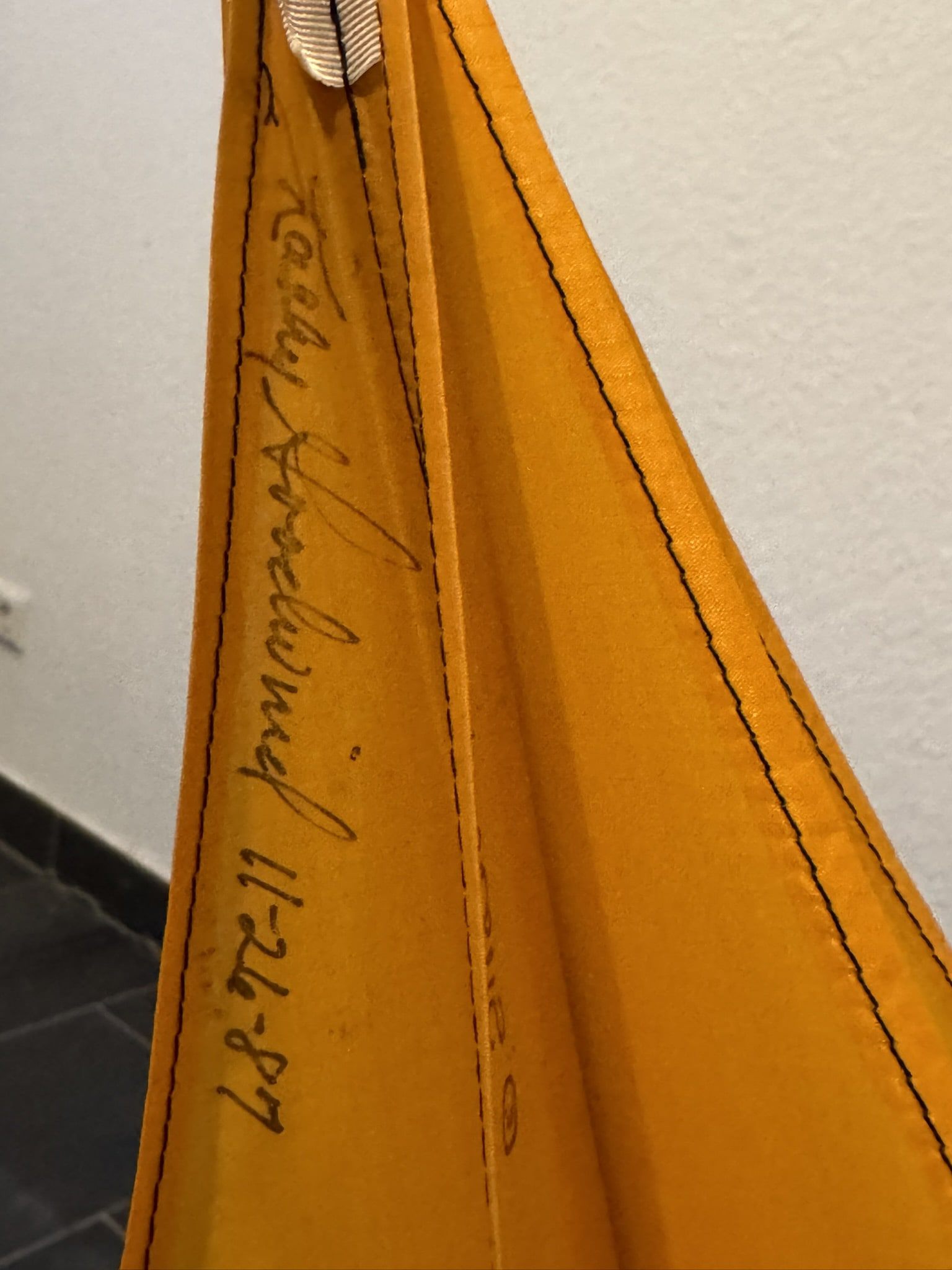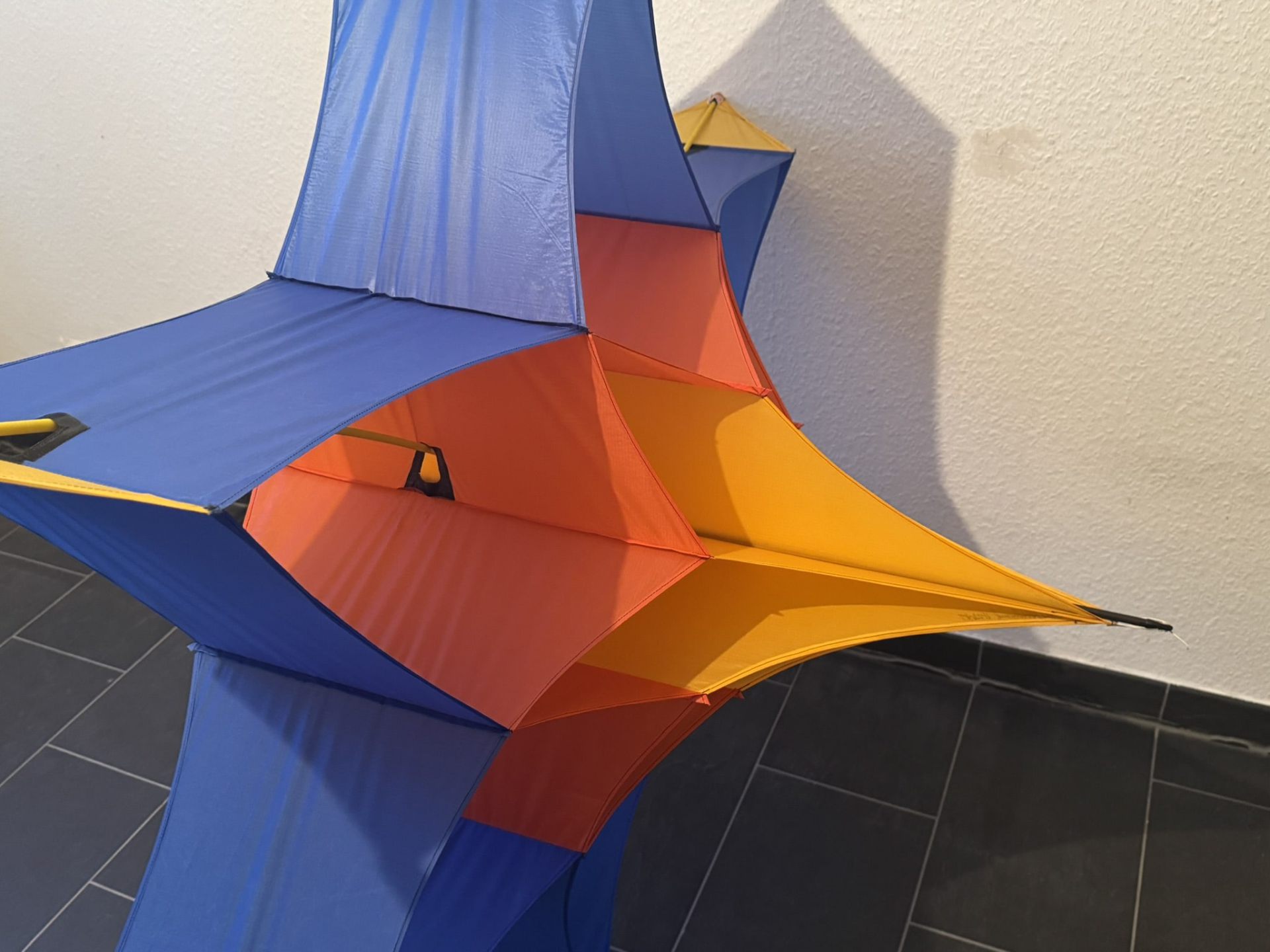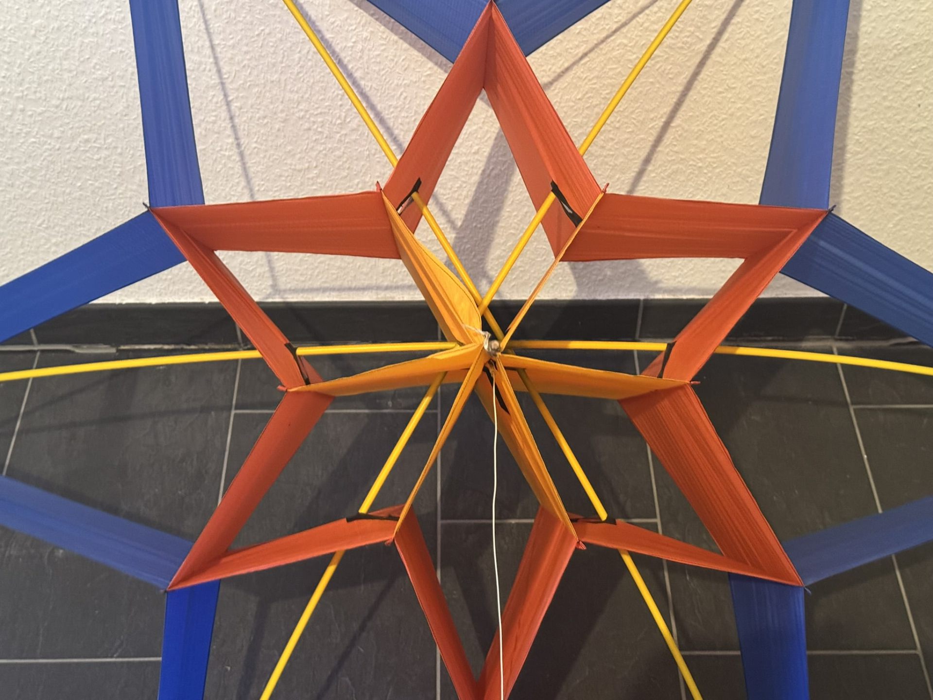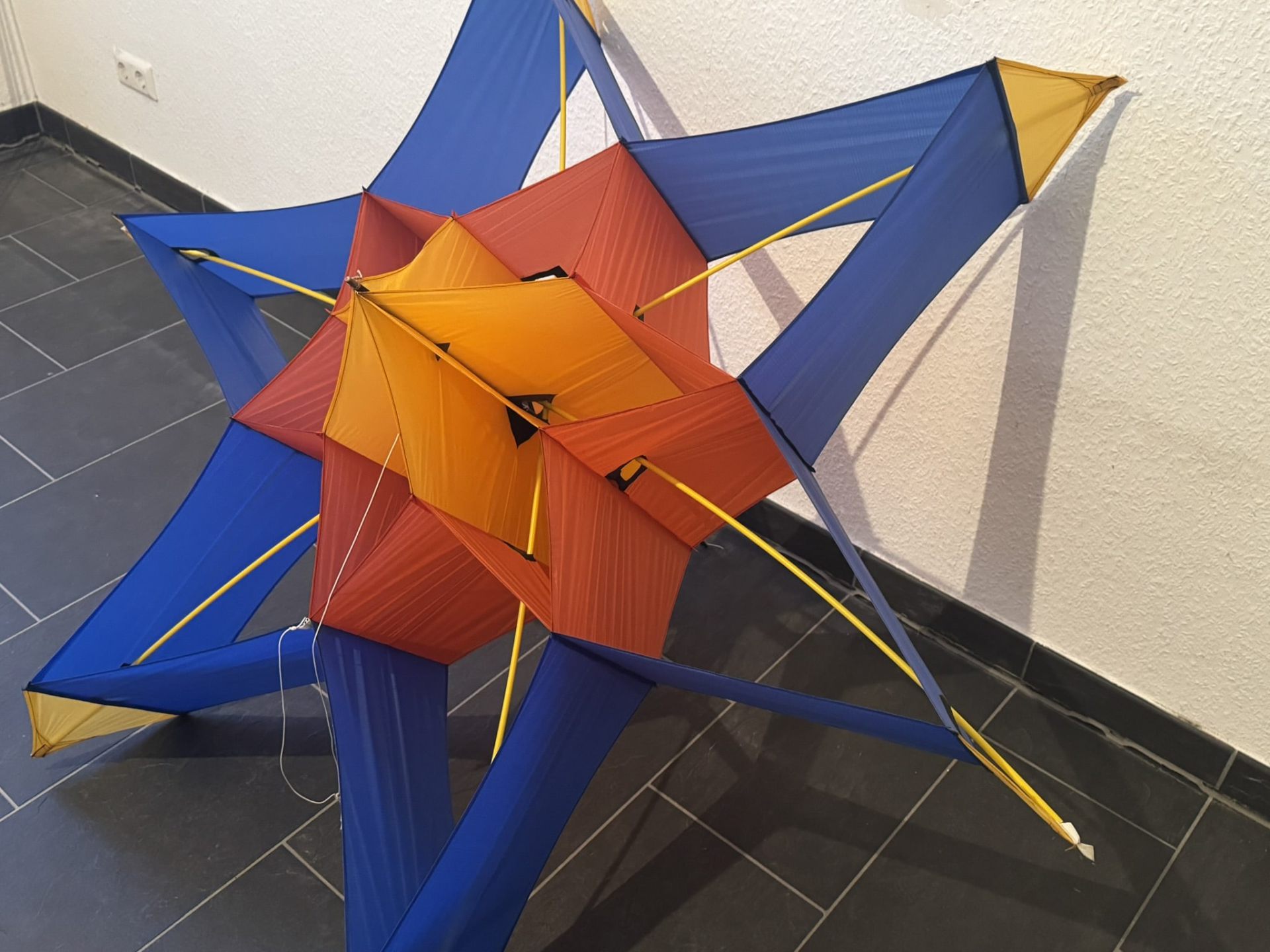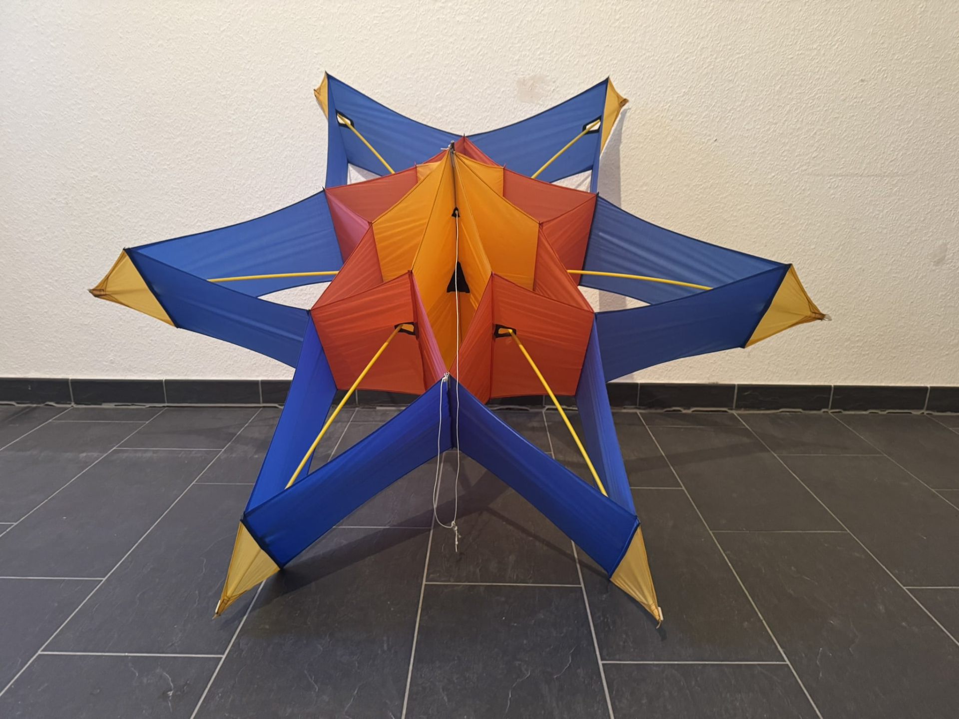 Der Suspended Elevation, auch bekannt als Tumbling Star, ist ein außergewöhnlicher Einleinerdrachen, der 1987 von der US-amerikanischen Drachenbauerin Kathy Goodwind entworfen wurde. Seine charakteristische, sternförmige Konstruktion kombiniert geometrische Raffinesse mit einem einzigartigen Flugverhalten, das den Drachen förmlich im Wind tanzen lässt. Gefertigt aus robustem Ripstop-Nylon und verstärkt durch leichte Glasfaserstäbe, ist der Tumbling Star nicht auf Stabilität ausgelegt, sondern auf lebendige, unvorhersehbare Flugbewegungen. Anstatt ruhig am Himmel zu schweben, vollführt dieser Drachen beeindruckende Drehungen, Kippbewegungen und taumelnde Manöver, die ihn zu einem faszinierenden Schauspiel für Drachenliebhaber machen. Ein besonderes Highlight dieses Exemplars ist die handschriftliche Signatur von Kathy Goodwind auf dem Segel – ein Zeichen seiner Authentizität und ein begehrtes Merkmal für Sammler. Diese persönliche Widmung macht den Suspended Elevation nicht nur zu einem Blickfang in der Luft, sondern auch zu einem kostbaren Sammlerstück am Boden. Der Tumbling Star eignet sich ideal für moderate Windverhältnisse und flache, offene Flächen. Durch seine unkonventionelle Flugweise wird er zum perfekten Drachen für Drachenflieger, die das Unberechenbare suchen und die spektakulären, tanzenden Bewegungen dieses einzigartigen Designs voll auskosten möchten.